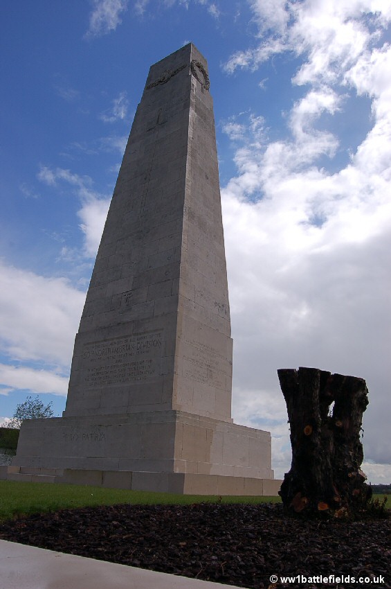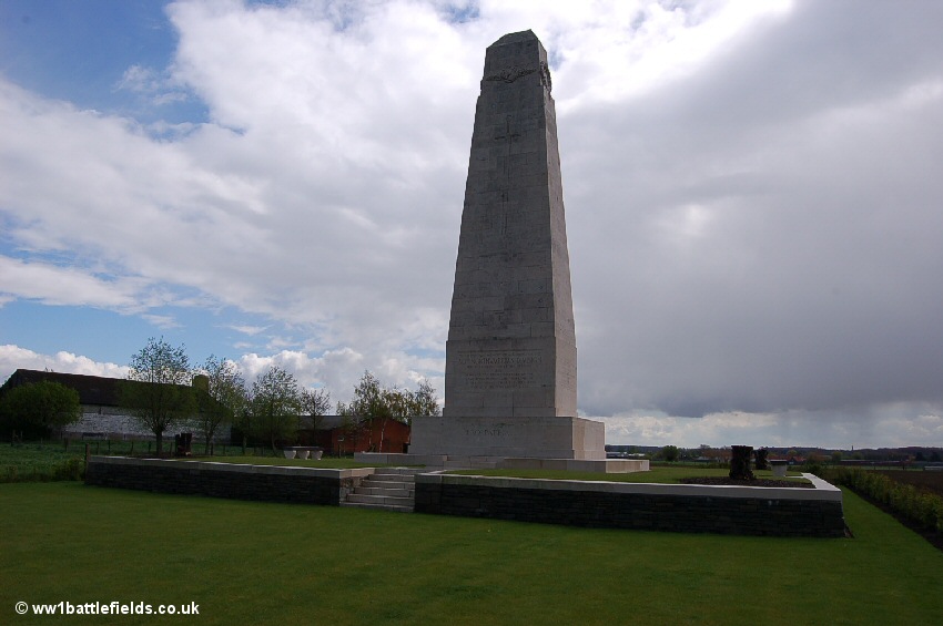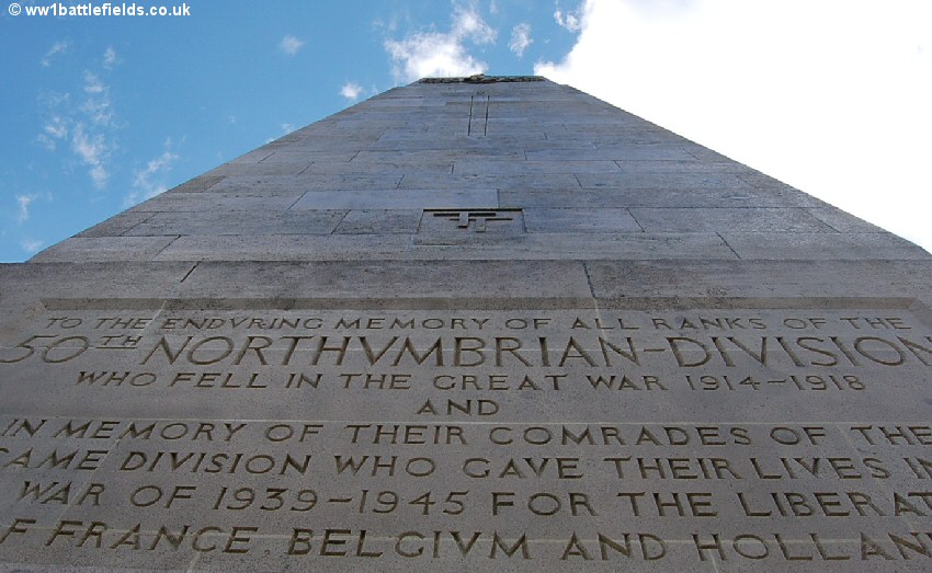 The 50th (Northumbrian) Division Memorial is reached by following the road just a little further along, heading away from Ypres. It is a tall, substantial and impressive obelisk, some 55 feet tall, and visible from quite some distance especially from the south. The memorial is set within a low wall within a lawned area, entered by a gate set in stone pillars, somewhat similar in appearance to many CWGC cemetery entrance gates. There are the stumps of four trees at the corners of the walled area.