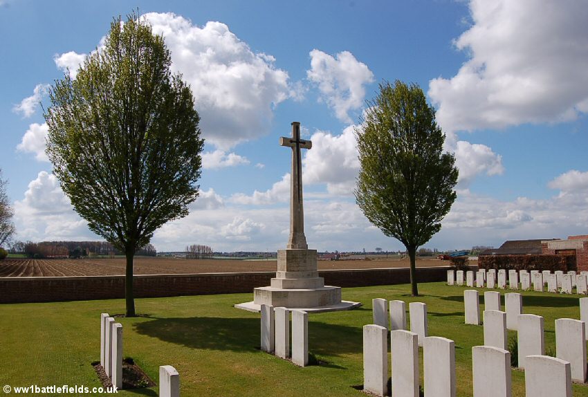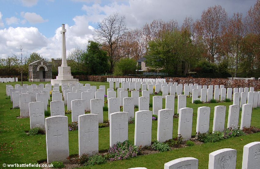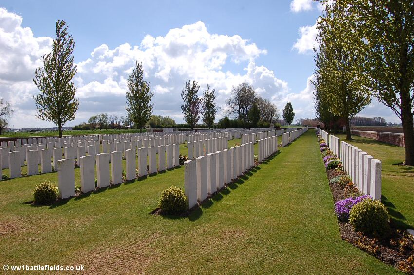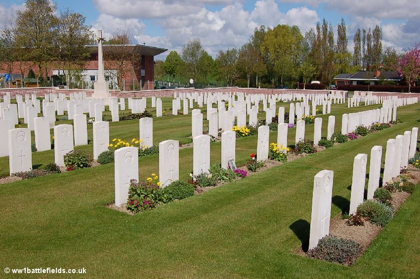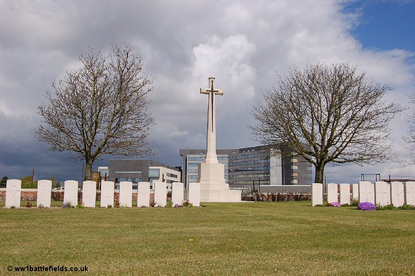 Oxford Road Cemetery is reached along a small road leading off to the right from the N313 a little before the motorway. Oxford Road was the name given to a road which ran behind the lines. The cemetery is irregularly shaped, with three "arms", the Cross of Sacrifice being set in the centre of these, and the story behind the cemetery is of interest. There were at one point two small cemeteries, located close to one another; firstly the original Oxford Road Cemetery started in August 1917 (now Plot 1, which is towards the far end of the left-hand "arm", by the Stone of Remembrance). Two months later, in October 1917, another cemetery was started close by, known then as Oxford Road Cemetery No. 2. These graves now form Plot 5 of the cemetery, towards the rear of the upper "arm". After the Armistice graves were brought into the cemetery to make plots 2, 3 and 4, effectively joining up the two original smaller cemeteries into one larger one.