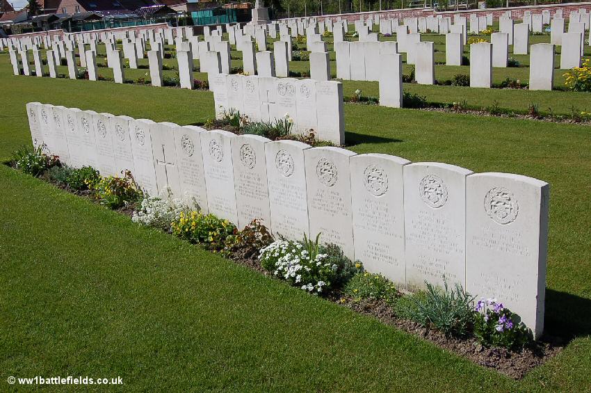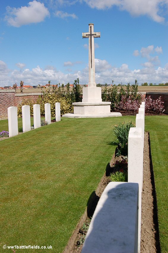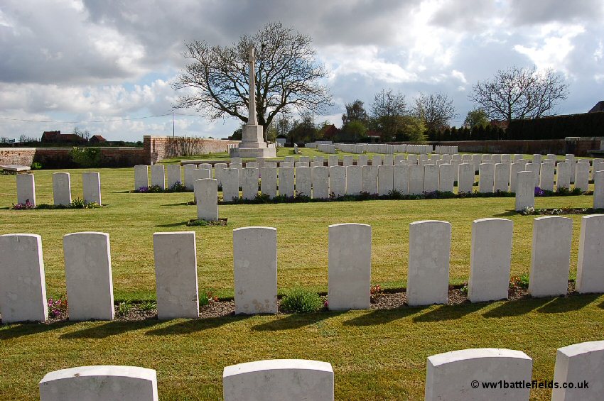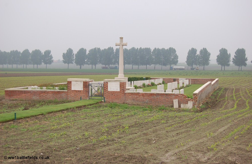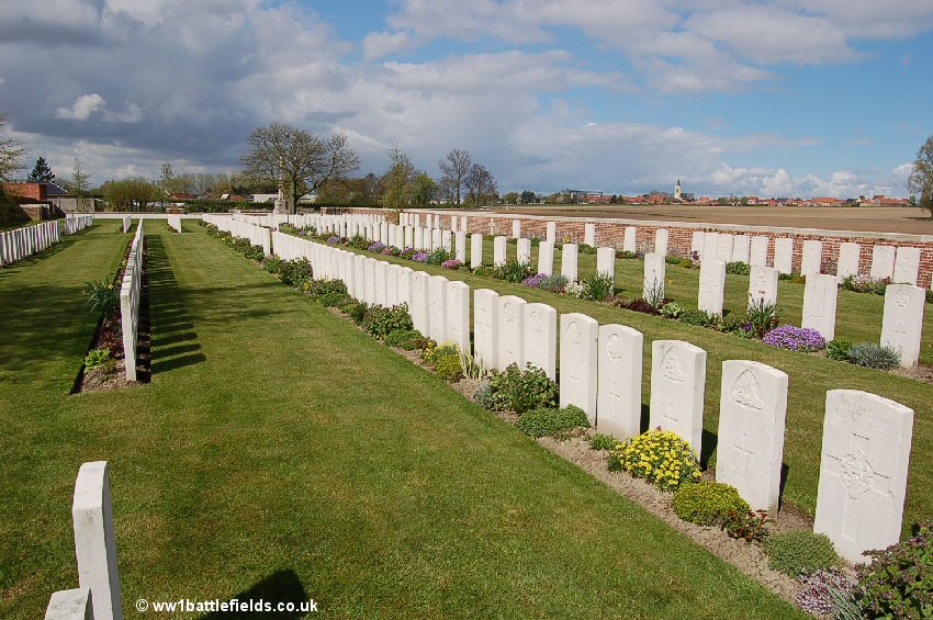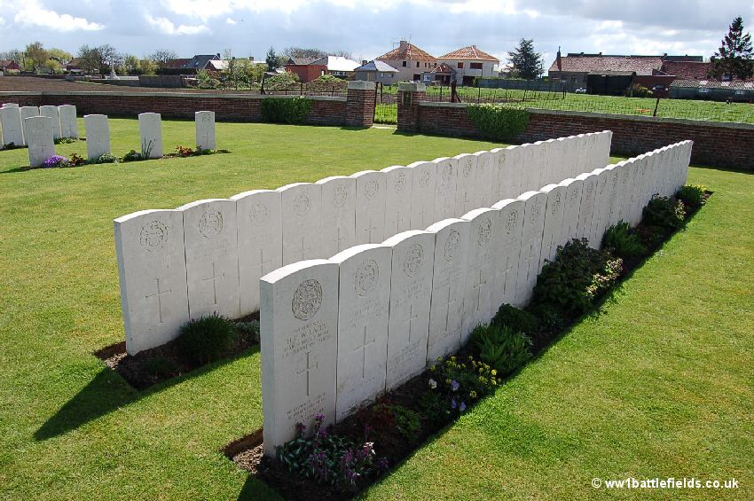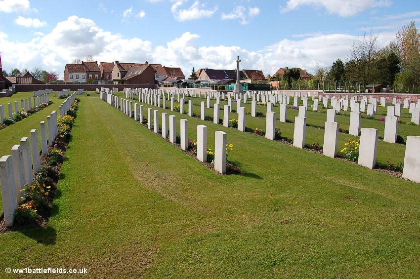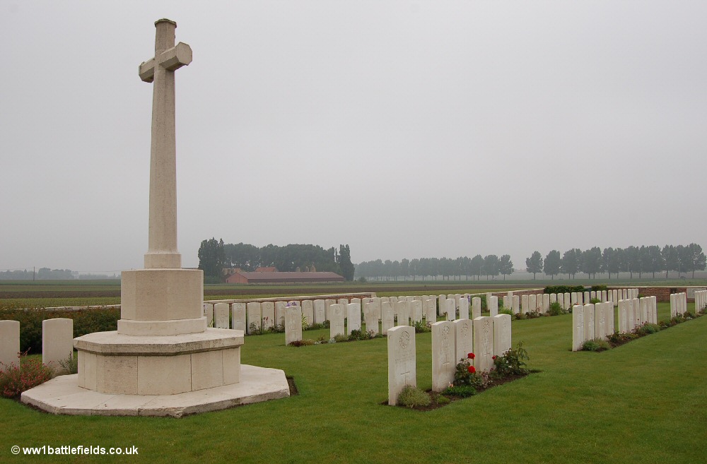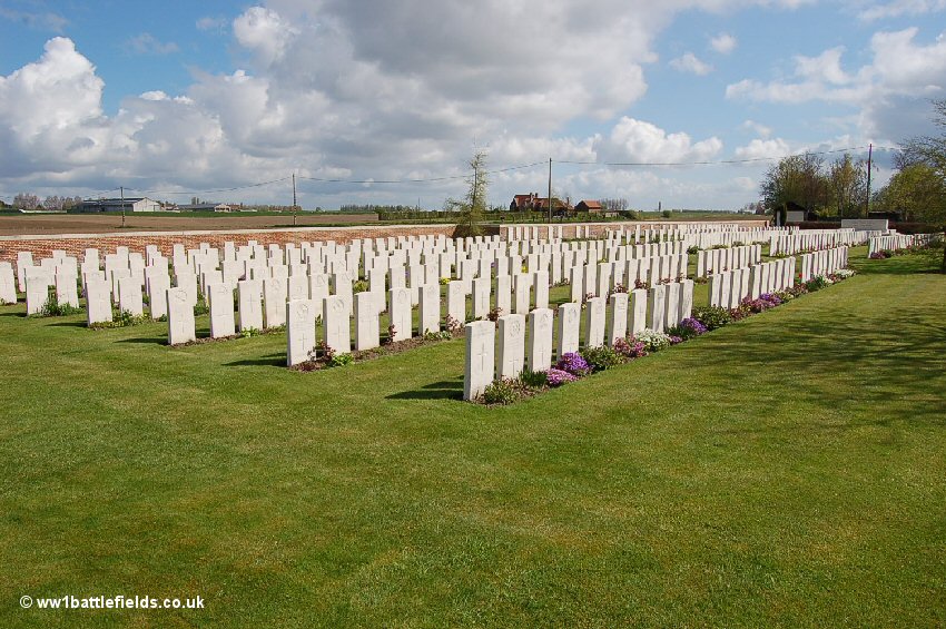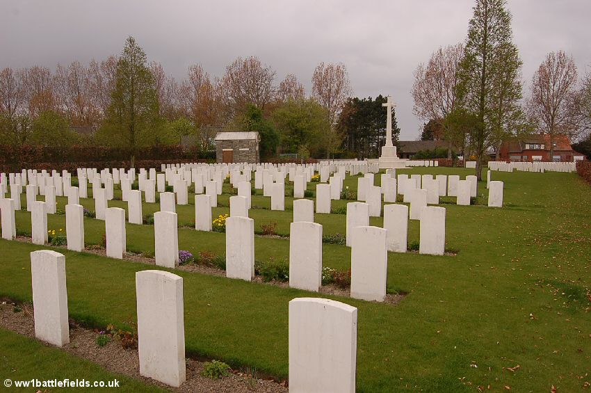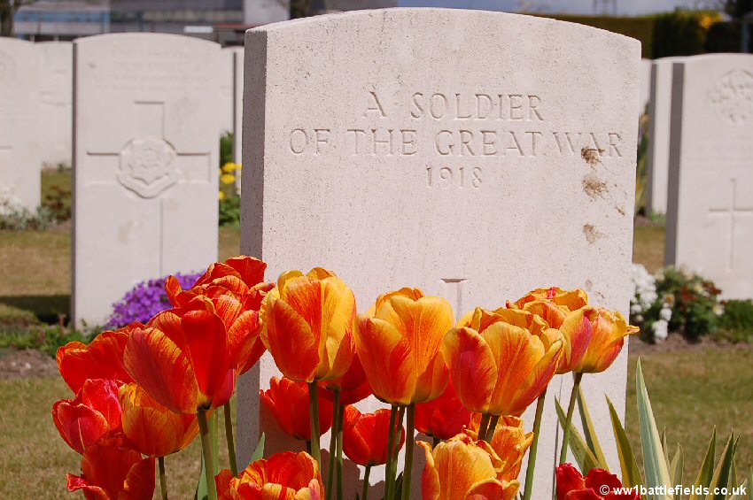 The earliest burials here are from Third Ypres, and there are special memorials (to men believed to be and known to be buried here) located at the front of the cemetery on both sides. The original cemetery is now part of Plot 1, towards the rear where the graves are noticeably less regular. Some of the graves in Plot 1, and in the more regular plots nearer the road were brought here after the Armistice. Over 600 of nearly 1,100 soldiers buried here are unidentified.
