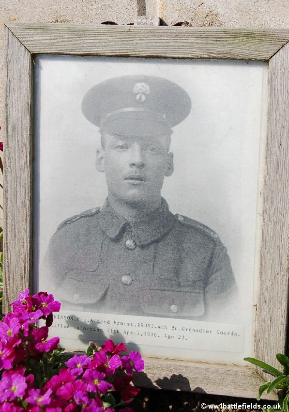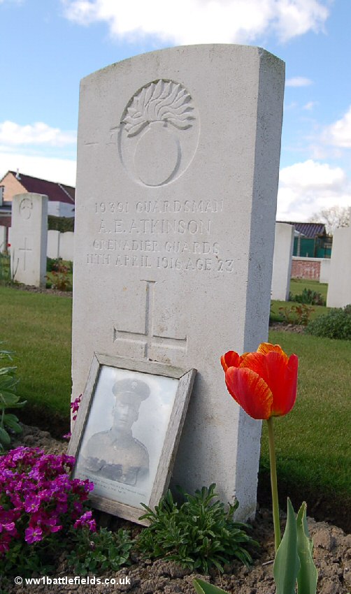 On the modern view, when enlarged, the fourth grave along on the has a small framed picture at the base. This is a picture of the soldier who is buried there - Guardsman Alfred Ernest Atkinson, of the 4th Grenadier Guards, who died on the 11th of April 1916, aged 23.