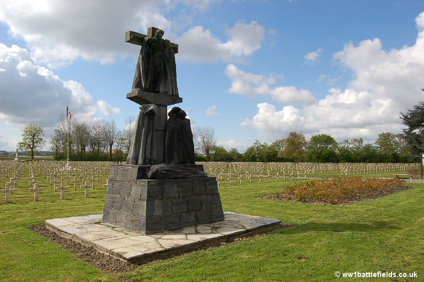 The French cemetery was started during the war, but the majority of graves were concentrated here after the Armistice from many other cemeteries. Within the cemetery is a sculpture depicting a mourning mother and a crucifix. Burials have very recently been made here, with four unidentified French soldiers buried here in April 2006. Their remains were found the previous October, near Pilckem.