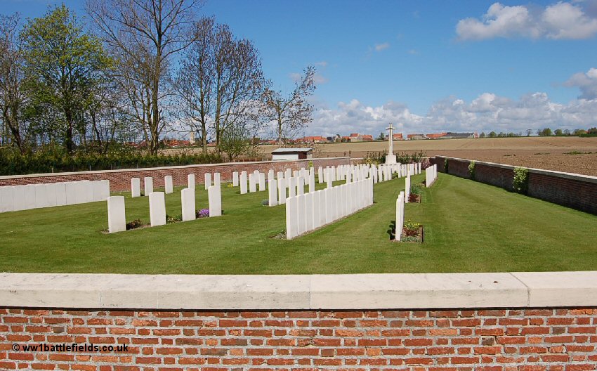 There are four cemeteries within the village; three are close together, based on their original location by the Chateau. They are reached by following a small cinder track, which is signposted with green CWGC signs, in between houses to the left of the N332 leading out of Ypres, just after the roundabout where the N332 crosses the N345.