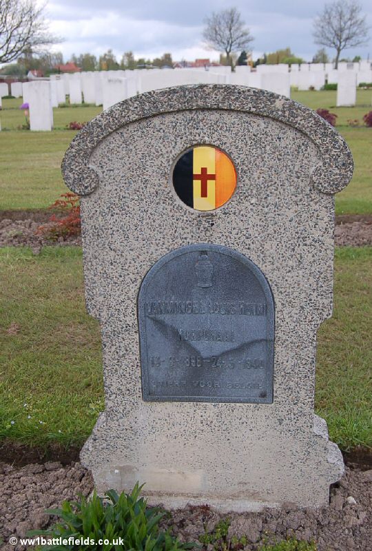 There are just three rows of graves and the reigster box can be found at the far end of the cem. There is also one German grave here, located at the end of the cemetery by itself. The cemetery was used for just a few months - between July and October 1917. One interesting burial here is Private Winstanley Carlyon-Britton. The register states that he was the eldest son of Major Philip Carlyon-Britton, was educated at Harrow, and had formerly served as a Lieutenant in the 5th Royal Dublin Fusiliers. However, he was serving as a private soldier in the 2/5th Leicesters when he was killed in action on the 26th of September 1917. On that day, the battalion were attacking near Dochy Farm which is a little south-west of s-Gravenstafel, and two or three miles from where he is buried.