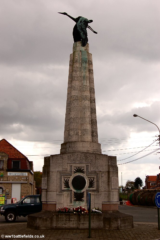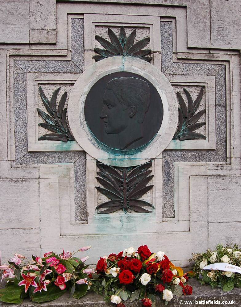 Guynemer had totalled 53 confirmed kills before he died, and his loss was keenly felt by France. He had previously been awarded the Legion d'Honeuer medal, and this memorial surmounted by a stork was put up at Poelcapelle in the 1920s to commemorate him. The stork motif is also shown on the side of the column, as is a relief carving of Guynemer in profile.
