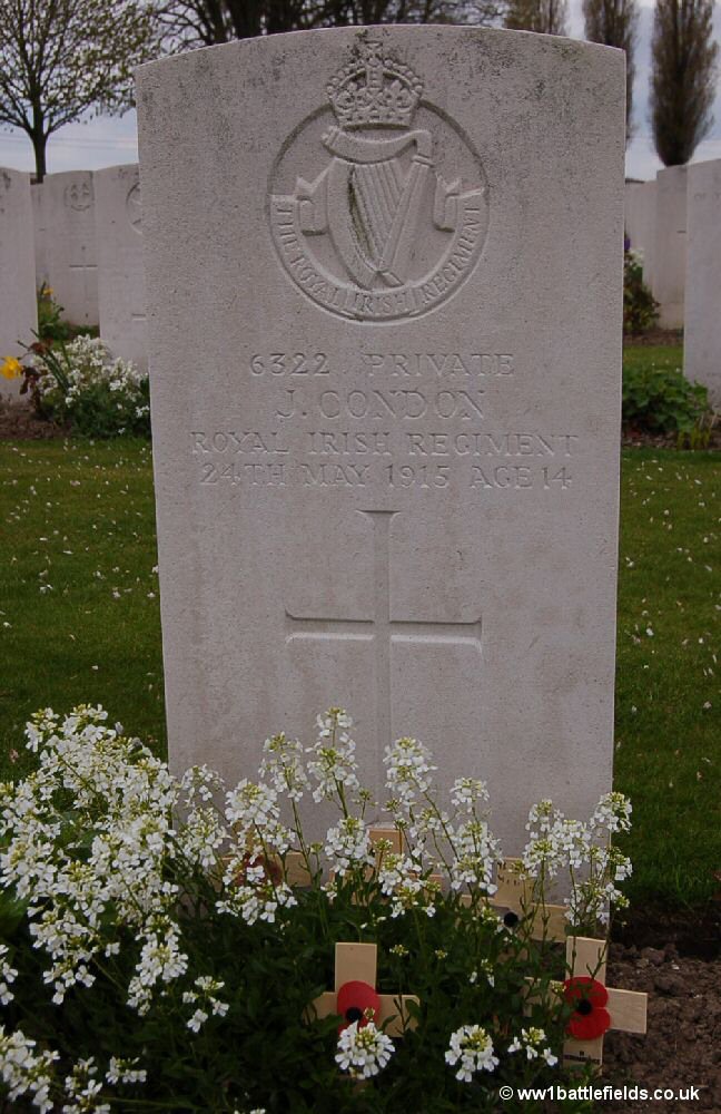 One grave here is said to be that of Private John Condon, listed in the cemetery details as aged 14 and 'thought to be the youngest battle casualty of the First World War commemorated by the Commission'. This is located in Plot LVI Row F grave 8, towards the back left of the cemetery. However, there is some dispute over the true age of Condon, and even whether it is he who is actually buried in this grave.