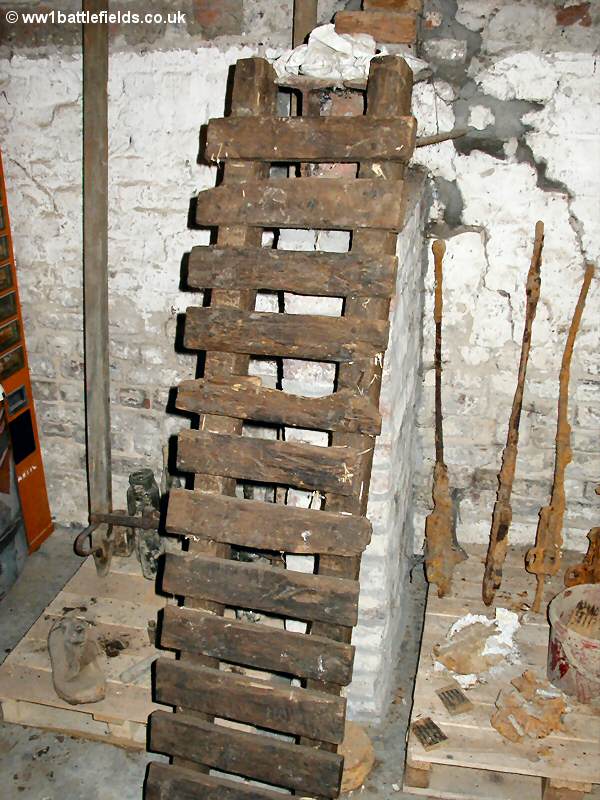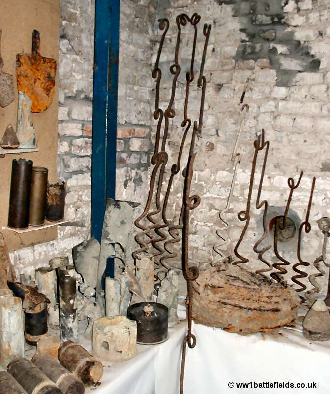 There are also duckboards, as would have been found at the base of trenches to help in passing through these especially when the weather was poor. Another feature of trench warfare was 'silent pickets' - iron poles used to hold up barbed wire, which had a 'corkscrew' shape at their base so they could be screwed silently into the ground rather than having to be hammered in (thus drawing the attention of the enemy to the activity). There are various different heights, and it is also possible to distinguish between British and German varieties. Some of these artefacts are from other sites, including the Yorkshire trench near Boesinghe.