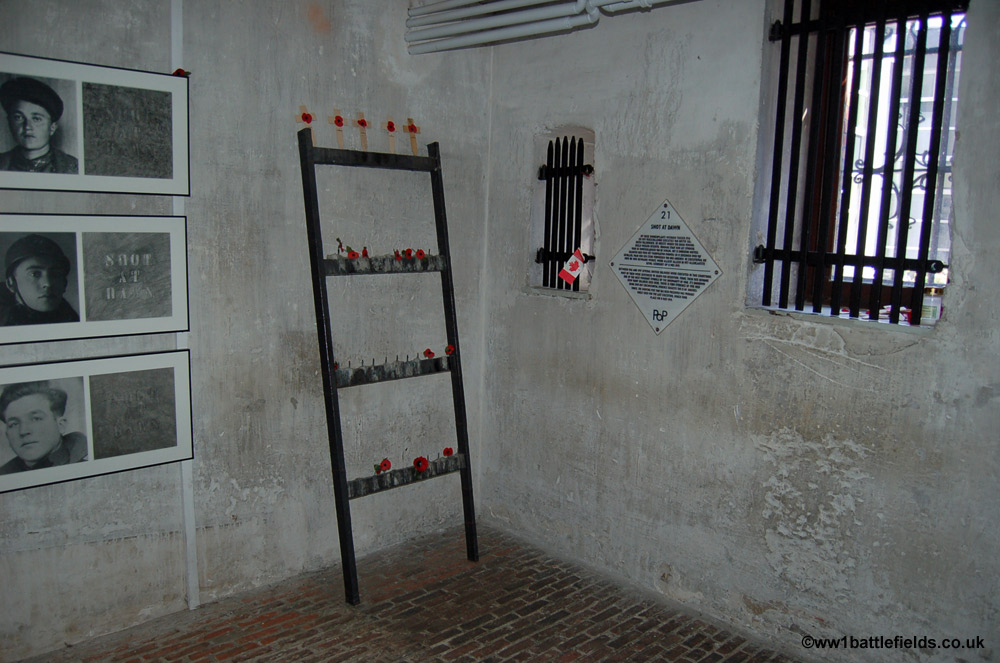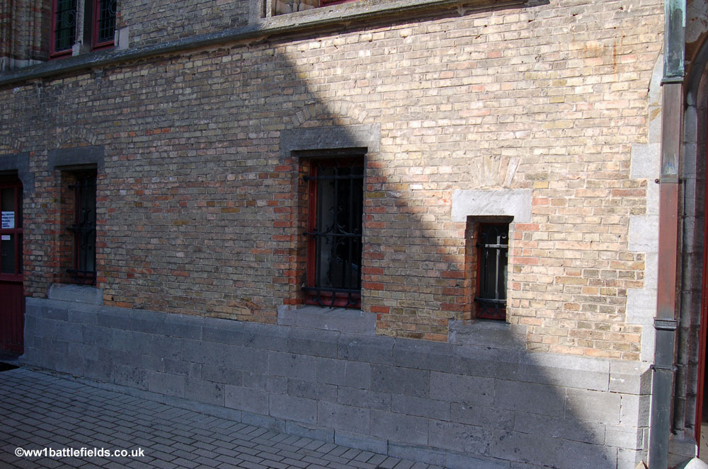 Within the town hall are 'execution cells' where some of the British soldiers condemned to execution during the Great War were kept awaing thier fate - to be shot at dawn. There were originally four cells, which were used by the police here before the war. Two of these small rooms have been restored; one with a simple pallisade bed and a lavatory bucket. In the other is one of many information plaques to be found throughout the town, this one - number 21 in the series - records that although the exact number of men shot here at the Town Hall is unknown, there is firm evidence for five. There are photographs of some of those executed on the wall, part of an artwork located here. The two small rooms have small barred windows and are very dark, even on a bright sunny day.