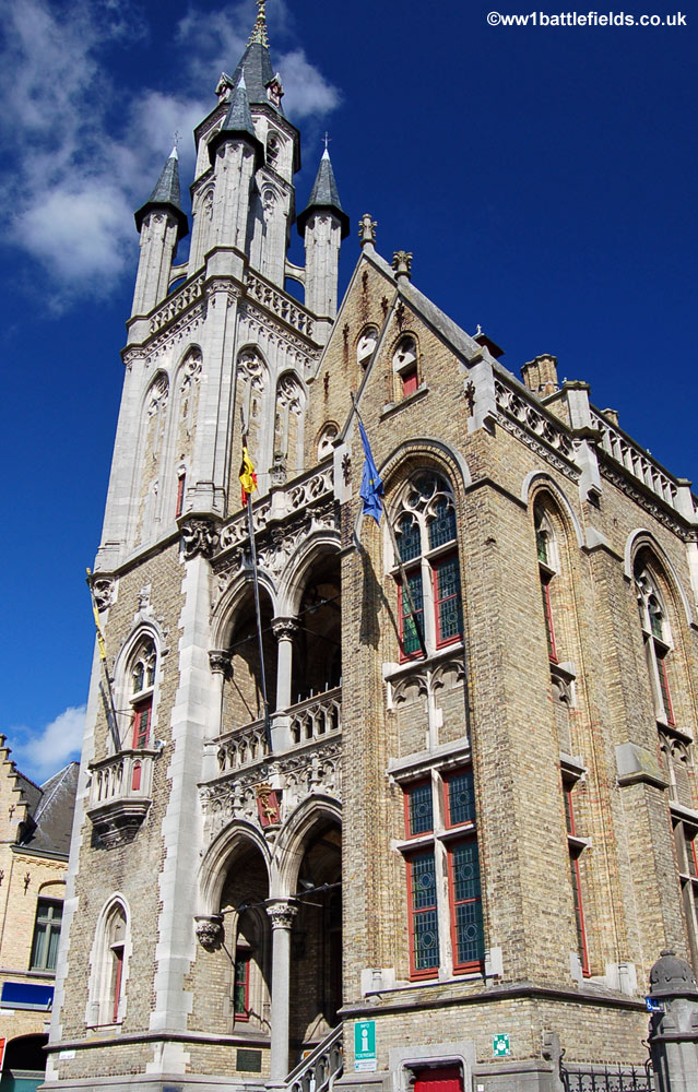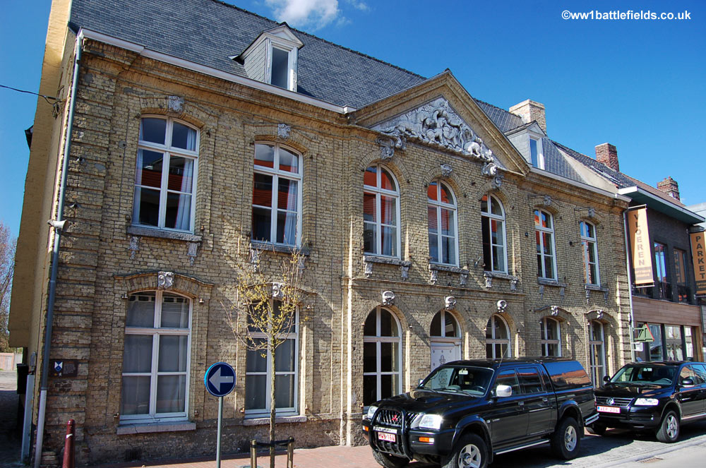 During the First World War Poperinghe was the centre of a large concentration of troops, and there were many camps in the countryside around it. There was generally at least one Division billeted in the town, and it was described in a very early battlefield guide as "a [wartime] centre for recreation, for shopping and for rest". The population before the War was about 12,000, but in 1917 there were as many as 250,000 soldiers billeted in the area. Starting in the town centre, the imposing Town Hall, built in 1911, can be found on the main square. It was used as a Divisional Headquarters during the War.