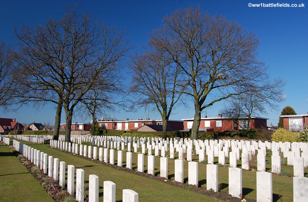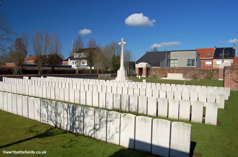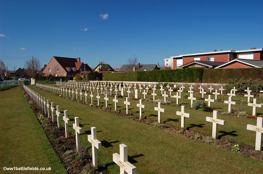 The cemetery was started during the First Battle of Ypres, and closed for military burials at the beginning of May 1915, when the New Military Cemetery (see above) was started. The cemetery here was full, at least in part, because nearly 500 civilians were buried here at the end of 1914, most having died in a typhoid epidemic. As well as the civilian burials, some 800 French and Belgian soldiers were also buried here. The civilian and the French and Belgian military graves were later removed, and perhaps they were buried in what is now the large empty space at the front of the cemetery.