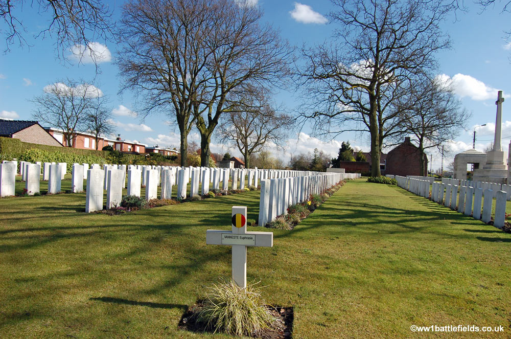 Towards the south of the town, on the N304 before it meets the ringroad is Poperinghe New Military Cemetery. Entrance is gained via two wooden gates set either side of the Cross of Sacrifice at the front of the cemetery. This is a rectangular shaped cemetery with regular rows of graves and mature trees standing within it. On the left hand side is a single Belgian grave by itself, with behind this at the left end of the cemetery a plot of French graves with one more Belgian burial in the back row.