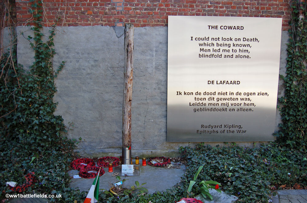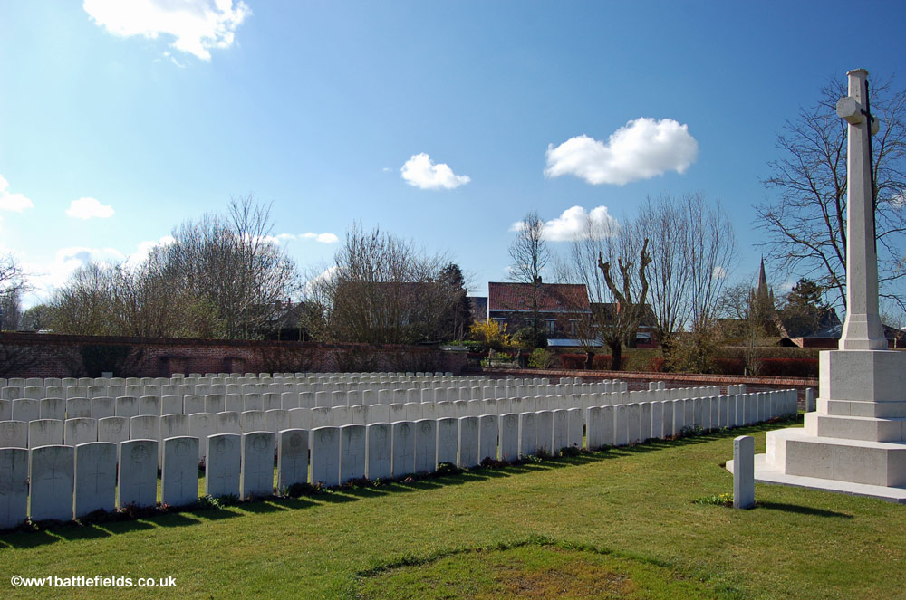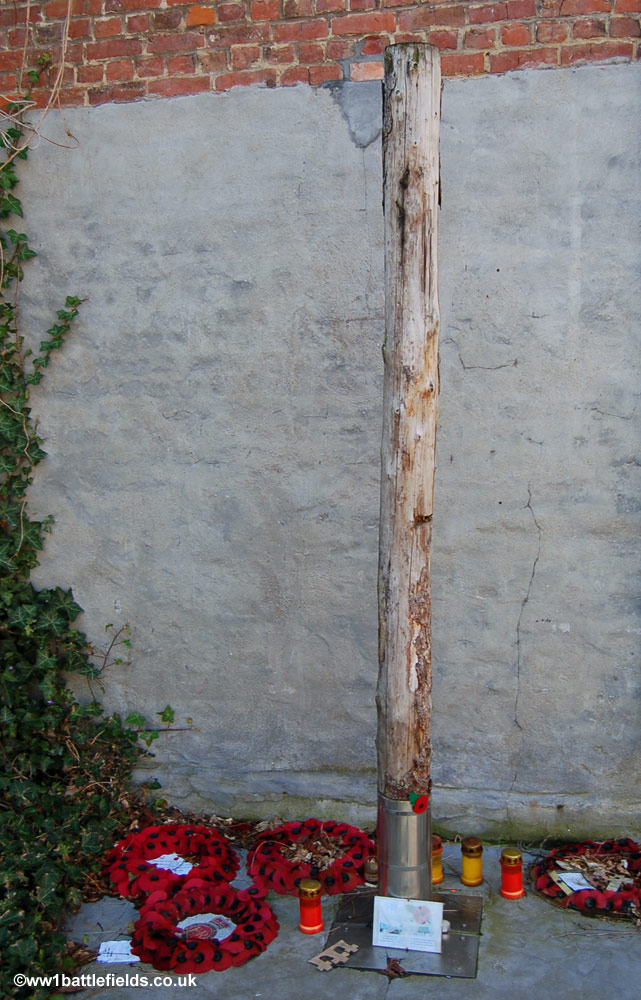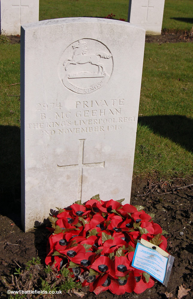 The cemetery also contains the graves of a number of British soldiers who were executed during the First World War, such as Private Bernard McGeehan. McGeehan served with the 1/8 King's Liverpool Regiment, and was executed at 6.16 a.m. on the 2nd of November 1916 for desertion. He was killed instantly. He had been ordered along with the other men in his battalion to return to their trenches on the Somme on the 20th of September 1916, but went missing until the 25th of September when he turned up at Montreuil, claiming he had got lost. By the 28th of September the 1/8 King's Liverpools were at Brandhoek between Poperinghe and Ypres, and McGeehan was escorted to rejoin them there. He was court-martialled and sentenced to death.