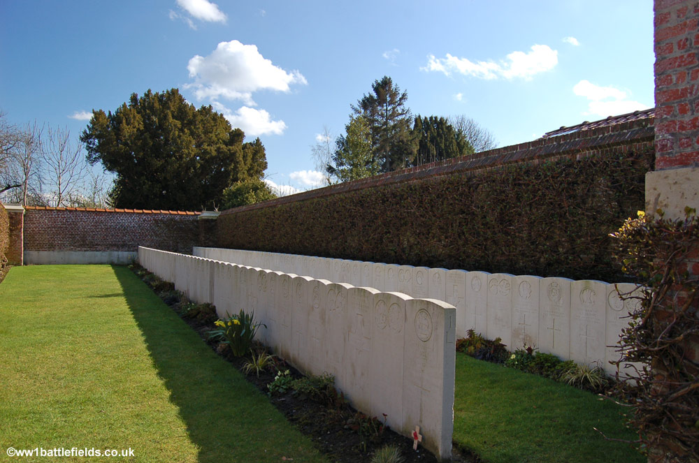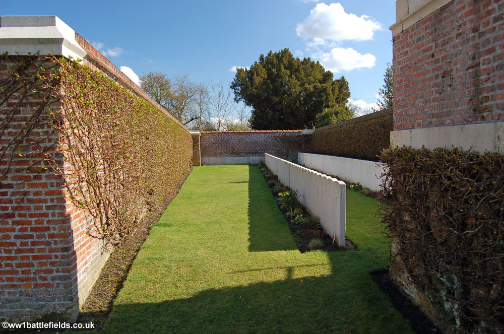 There are seven special memorials to men believed or known to be buried in the cemetery at the right hand side of the lawned space at the front of the cemetery near the entrance, and one German grave at the back. However, the cemetery is larger than appears at first sight. Hidden from view initially is a rectangular area extending off to the rear left of the cemetery and there are more graves (Plot 1) in this walled area.