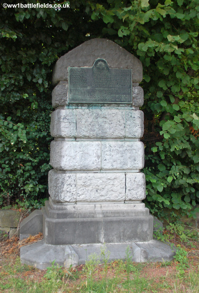 About three miles to the north-east of Mons, on the main N6 road that leads to Soignes, are two memorials commemorating the first and last shots of the Great War. On the left hand side as you head away from Mons is the First Shot Memorial. This is a short blockwork obelisk which is now sadly in a poor state of repair, and is set back in the bushes by the side of this farily busy road. The text on the plaque, first in French then below in English states "This tablet is rerected to commemorate the action of "C" Squadron 4th Royal Irish Dragoon Guards on 22nd August 1914, when Corporal E. Thomas fired the first shot for the British Expeditionary Force, and Captain C.B. Hornby led the first mounted attack against the Germans". Between the 12th and 17th of August, the BEF had been crossing the channel to France. They then travelled to the area near Mons and were largely in position by the 20th. On the 22nd, 'C' Squadron sent out two patrols from Obourg in the direction of Soignes, and here they encountered a German piquet, on which they fired, forcing the Germans to retreat. Ironically, the memorial was unveiled in 1939, just before the start of the Second World War.