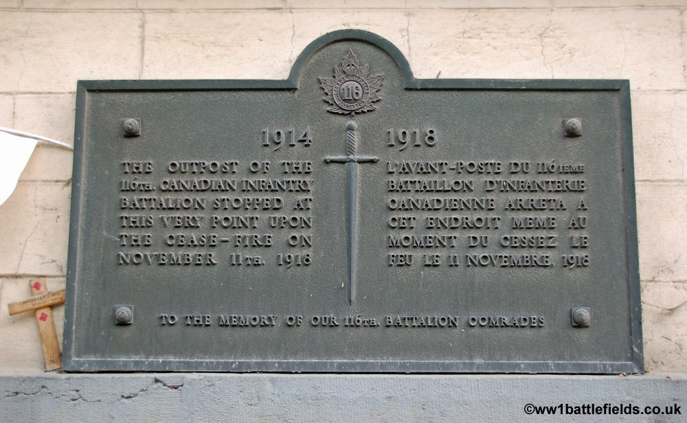 On the opposite side of the road is a plaque on the wall of a restaraunt (Le Medicis) commemorating the spot where the 110th Canadian Infantry Battalion stopped at the moment of the armistice on the 11th of November 1918. The plaque is on the right hand front of the building.