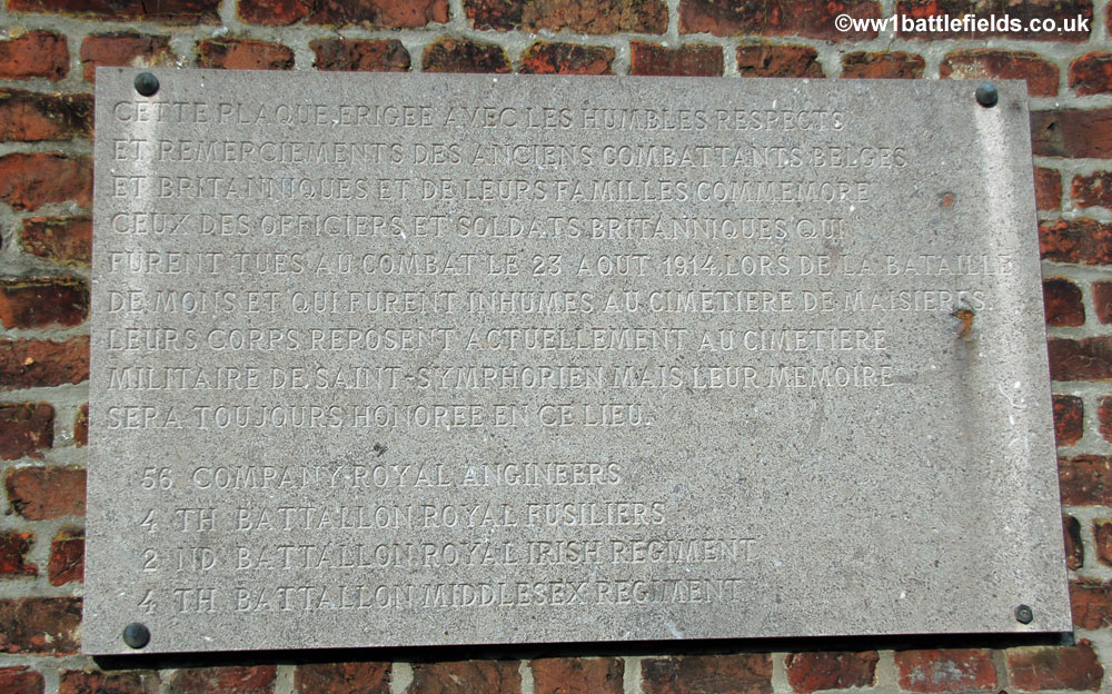 Also located on the N6, a little further towards Mons, is a church on the left as you head towards Mons. This is Maisieres church, and on the wall is a plaque which (in French) commemorates men from the BEF who died here on the 23rd of August, 1914. Specifically, the plaque mentions men from the 56th Company Royal Engineers (here spelt 'Angineers'), the 4th Battalions of both the Royal Fusiliers and the Middlesex, and the 2nd Battalion of the Royal Irish Regiment. These men were originally buried in the cemetery here at Maisieres, although their bodies were later moved to the cemetery at Saint Symphorien (see above).