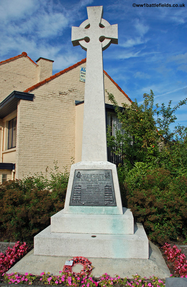 A memorial to the Royal Irish Rifles is also located by the same cross-roads. The RIR memorial is in the form of a Celtic cross, with a bronze plaque at the base which lists the battle honours of the regiment and also states "Near this spot the 2nd Battalion commenced operations on the 23rd August 1914 and finished on 11th November 1918 after being decimated on four occasions".
