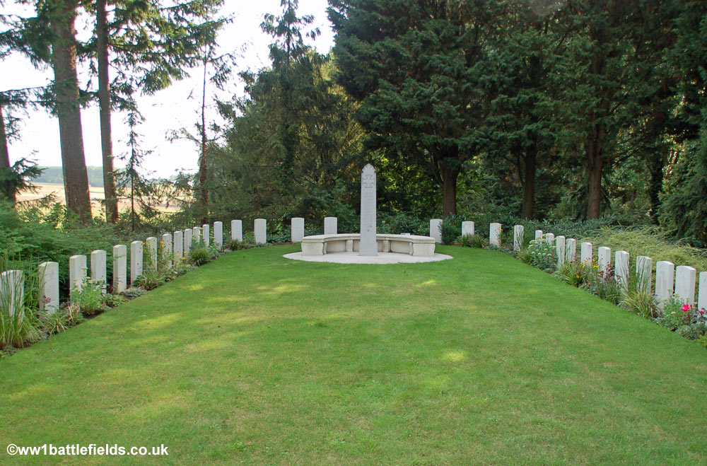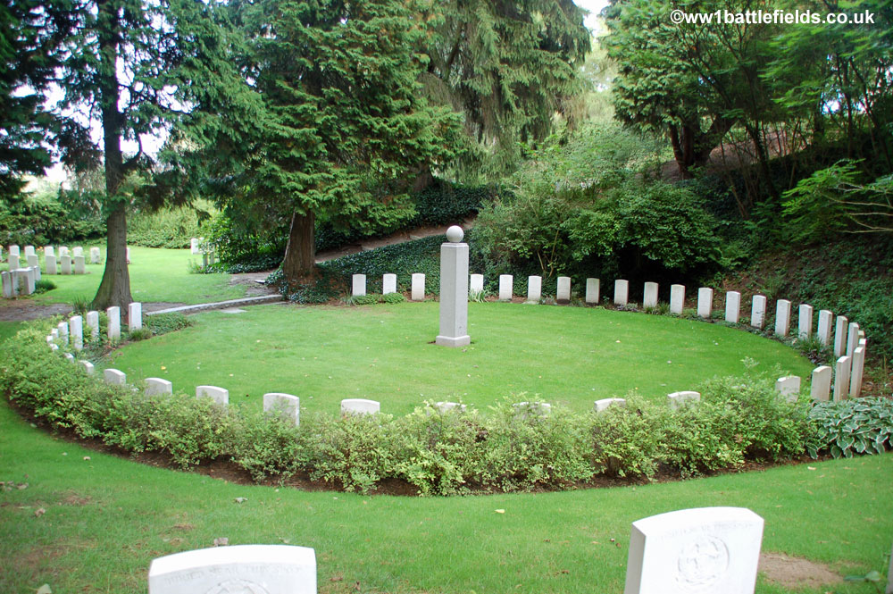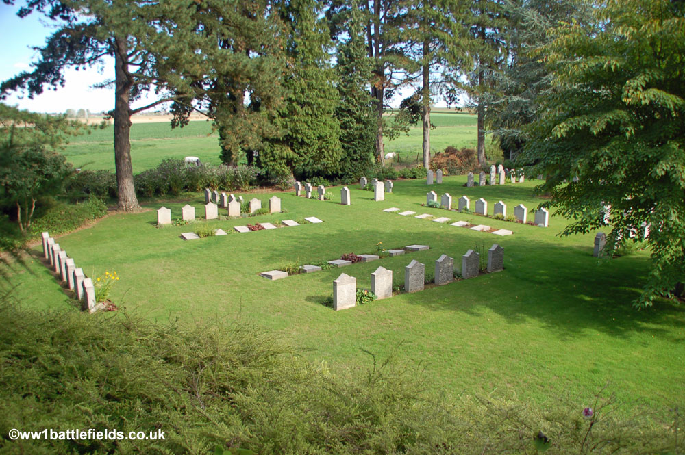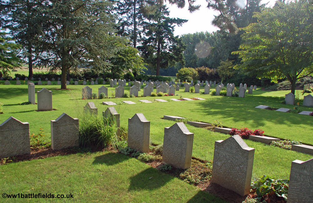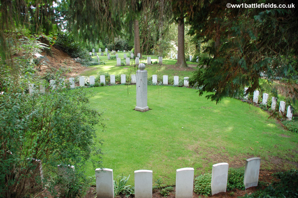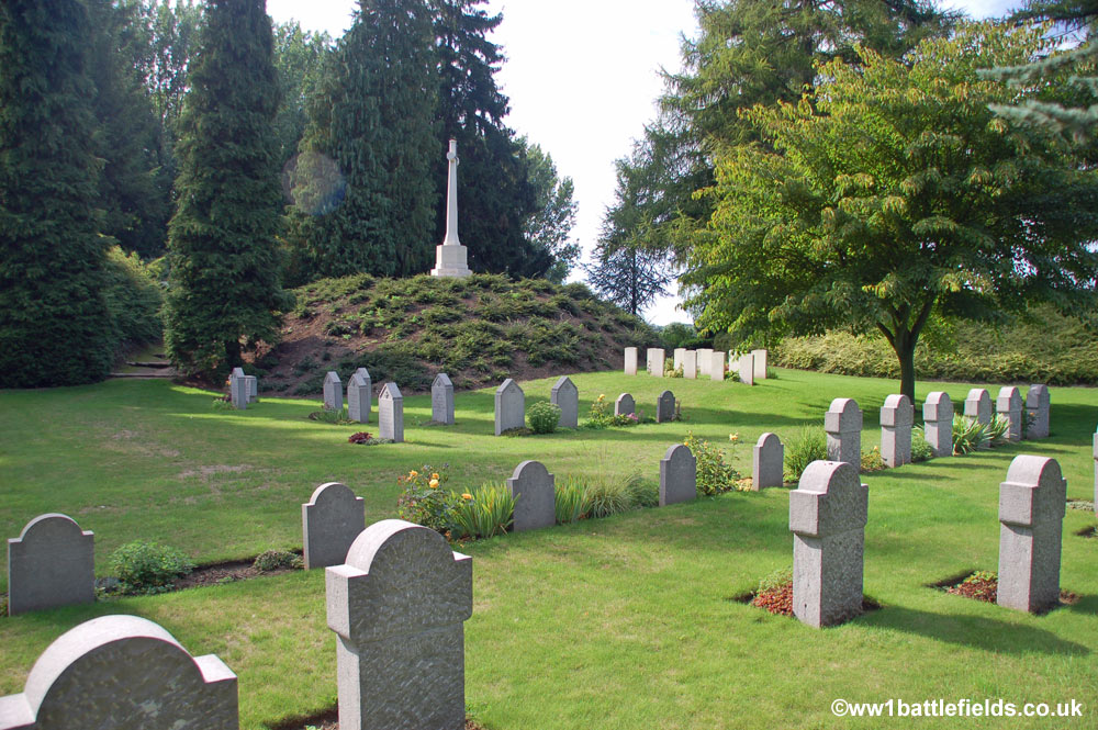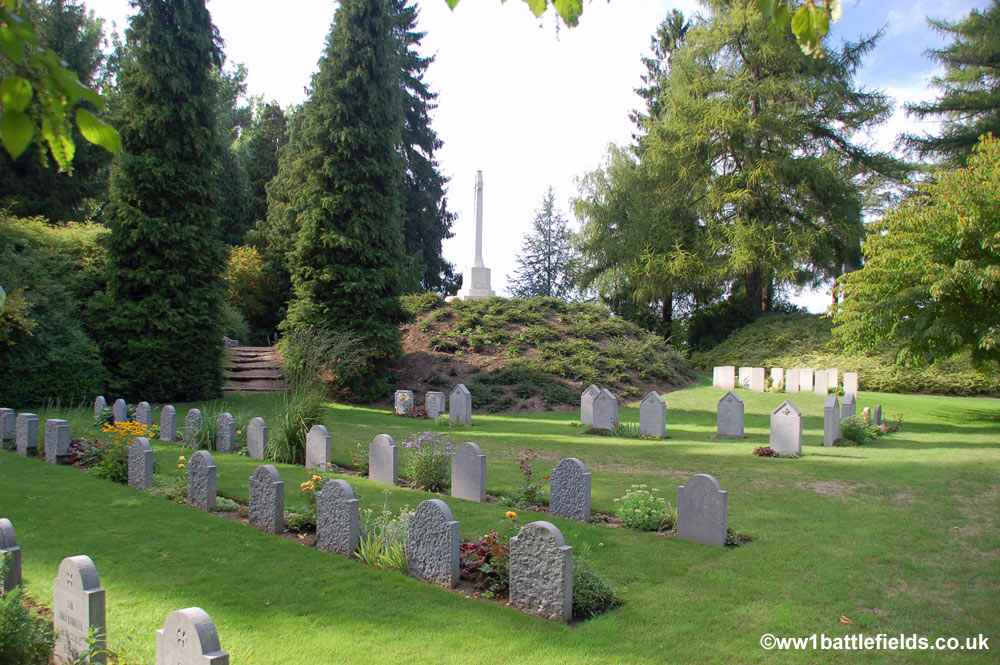 From the obelisk on top of the mound there are good views to the right and left across the cemetery which was designed to resemble a park, with separate and distinct areas for groups of graves. The cemetery was originally started by the Germans in August 1914, after the Battle of Mons. By the Armistice there were 245 German and 188 Commonwealth graves here, but this number was later added to by the concentration of graves from a number of other burial sites and cemeteries. There are in total a little over 500 graves here today, with 229 Commonwealth burials, and 284 German graves.