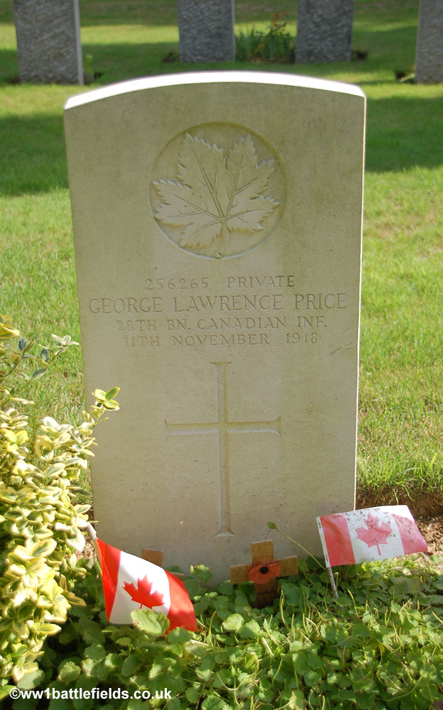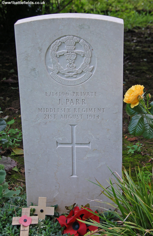 As well as the memorials mentioned above, there are a number of interesting graves within the cemetery, including, by anecdote at least, those of the first British and last Imperial forces soldiers to die in the Great War. The former is Private John Parr of the 4th Middlesex, who was killed, aged 20, on the 21st of August 1914 according to his headstone, although there is some dispute about whether he died that day or the day after. Private George Price, a Canadian soldier of the 28th (Saskatchewan) Regiment, is reportedly the last Imperial force soldier to die in action in the Great War; he was killed at 10:58 a.m. on the 11th of November 1918 by a German sniper.