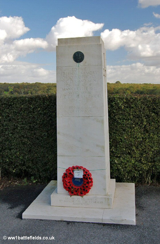 On the front of the memorial are the words 'To the eternal memory of 1039 officers NCOs and men of the 12th Bn. Manchester Regiment who made the great sacrifice 1914-1918. Thier name liveth for evermore'. At the top of the stone column is the regimental emblem in bronze, and on either side a carving of a sword is inset in the stone. The memorial was erected by relatives and the 12th Manchesters Old Comrades Association. The number listed represents the total number killed during the war, but on the 7th of July 1916 the 12th Manchesters lost nearly 600 men in an abortive attack on the Quadrangle support trench not far from here. The battalion were only ordered to this attack just before it commenced, and had to try and 'catch up' to reach their positions.