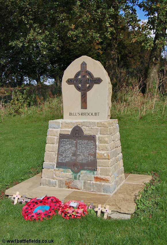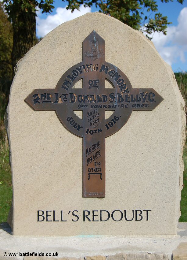 Sadly, for this brave man he did not pull through; he was killed, here, when on the 10th of July he undertook a similar brave action, again attacking a machine-gun post. The bronze cross at the top of the memorial is a reproduction of the original wooden cross placed here by the men of his battalion in his memory. His body was moved in 1920 to Gordon Dump Cemetery, again about a kilometre to the west, and probably very near to where he won his V. C. The spot where he was killed was named 'Bell's Redoubt', and is marked as such on some trench maps.