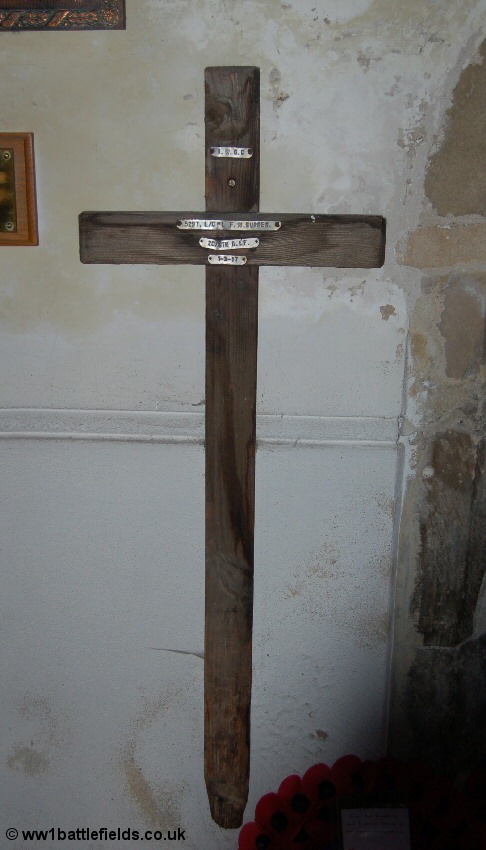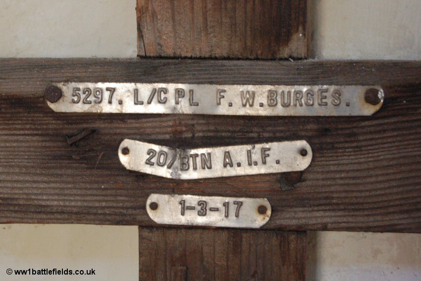 The grave of Lance-Corporal Frederick William Burges, another Australian, is set by itself beneath a tree (to the right in the picture above). It is the final grave in Plot 1 Row E. Although Burges served with the 20th Australian Infantry Battalion, he was actually a native of Wiltshire, England. He had grown up at Mann Farm, in the small village of Boyton in the Wylye Valley north-west of Salisbury. His family were comfortably off; with a governess, housemaid and nursemaid recorded in the 1901 census. The original IWGC wooden cross which stood over Frederick Burges' grave can still be seen in St. Thomas a Beckett Church in the centre of Salisbury.