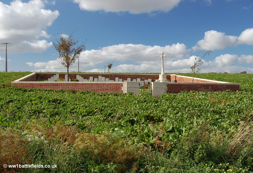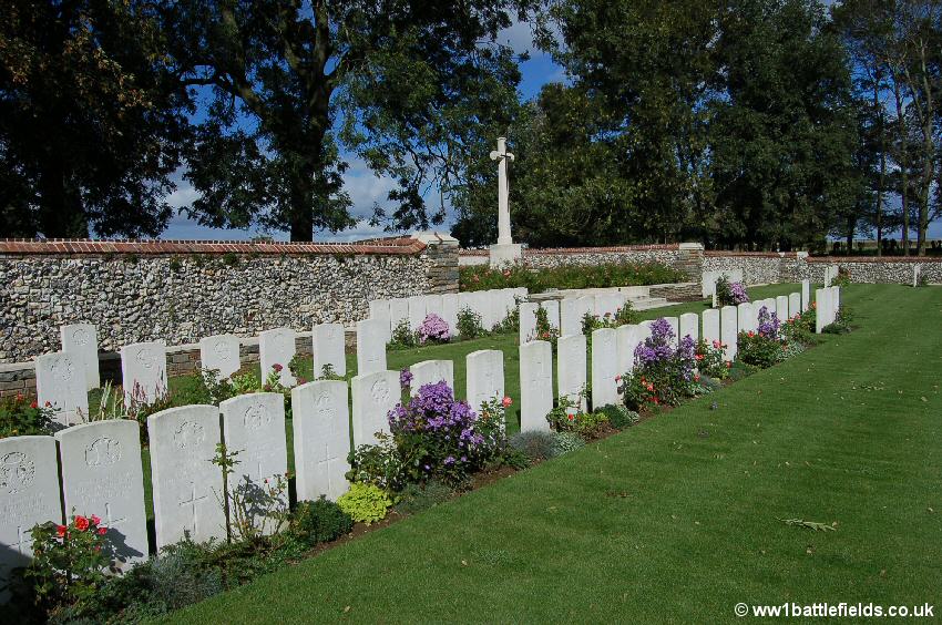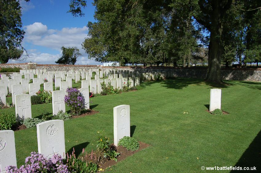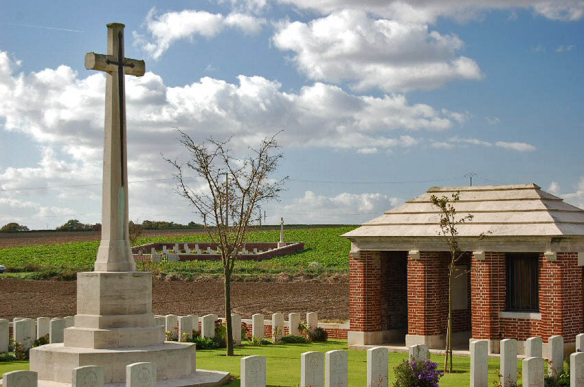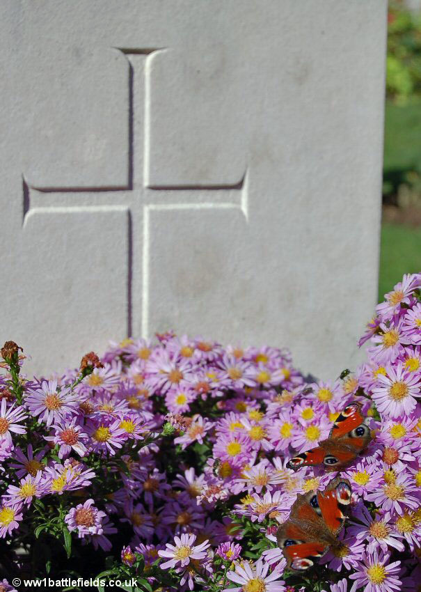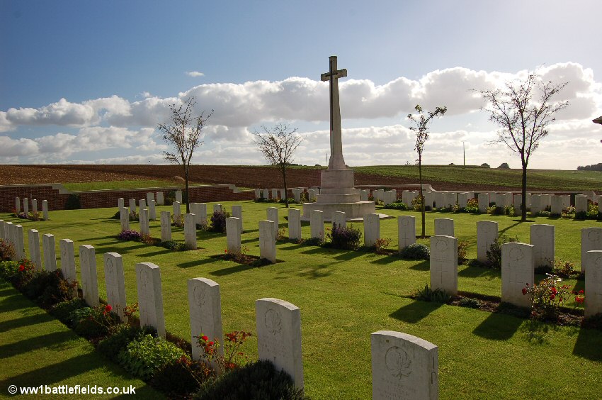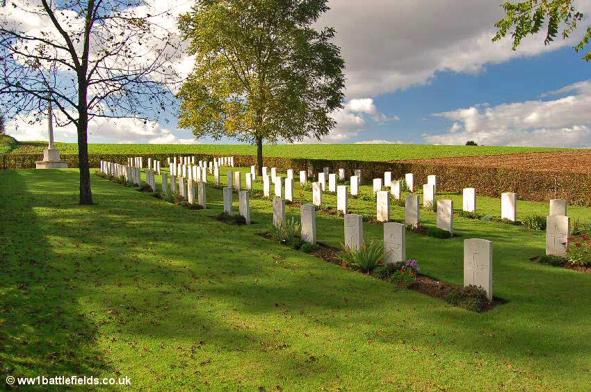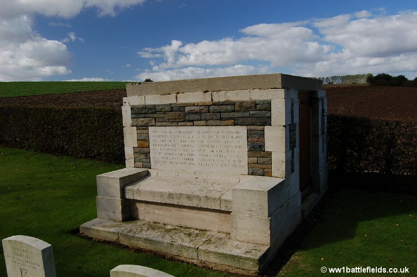 There was an Advanced Dressing Station situated near here in 1916, which was in full view of the enemy. Many of those buried here died in July, August and September 1916, although there are few 1st of July graves. The Land Tablet (the stone tablet stating that the land for the cemetery was ceded in perpetuity) is inset in the back of an attractive stone seat within the cemetery.