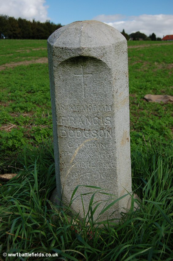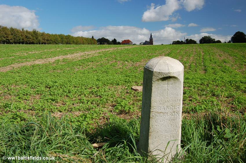 A small track in the valley between Contalmaison village and Peake Wood Cemetery runs north from the road. Beware that here, as in many other areas on the Somme during the season, hunters with shotguns stalk the fields and the sound of shots rings out regularly. However, a few hundred yards along this track on the right (at a point to the west of the village itself) is a small private memorial to Captain Francis Dodgson. This resembles a small bollard, and is leaning considerably.