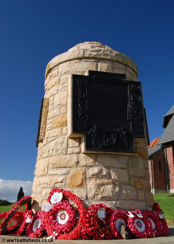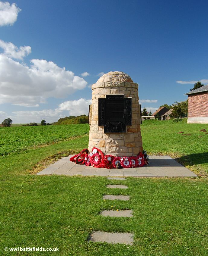 In the centre of the village next to the church is one of the newer memorials on the Somme Battlefield. This was erected in 2004, to the 16th Royal Scots, also known as McCrae's Battalion. The memorial is made from stone brought here from Scotland, and was constructed by Scottish craftsmen. The bronze panels on the memorial were carved in Kirkwall.