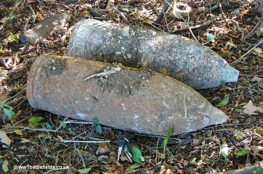 In October 2006, the 'iron harvest' that the fields of the Somme still yields was evident here. By the wall of the cemetery was a shell (left picture below), and in the small copse (Peake Wood) on the opposite side of the road were two very large shells (right picture below). My car keys set beside them give some idea of the size - and if you enlarge the right hand picture by clicking on it, the smaller shell in the background is the same size as the one in the left hand picture. Once I had taken the pictures of these shells, I left them well alone and continued my battlefield tour. Even after 90 years, this ordnance can be lethal, and if you see such iron harvest whilst visiting the Somme, by all means take pictures, but please leave the shells where you find them.