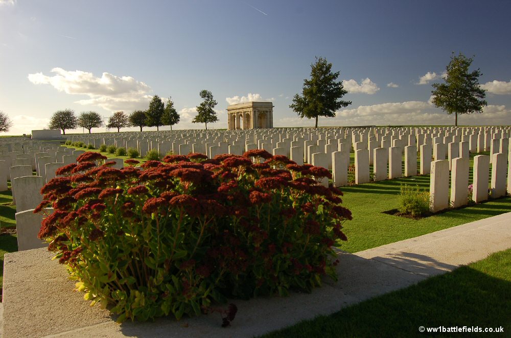 Nearly 1,900 more graves were brought in to the cemetery after the Armistice, most of these being from near here and around Pozieres. At least two other small cemeteries were concentrated here - Mouquet Farm Cemetery and Red Chateau Cemetery, which was in Courcelette and described as being 'at the entrance to a ruined dug-out'. The total number of burials and commemorations now is 1,970; nearly 60% of these are unidentified.