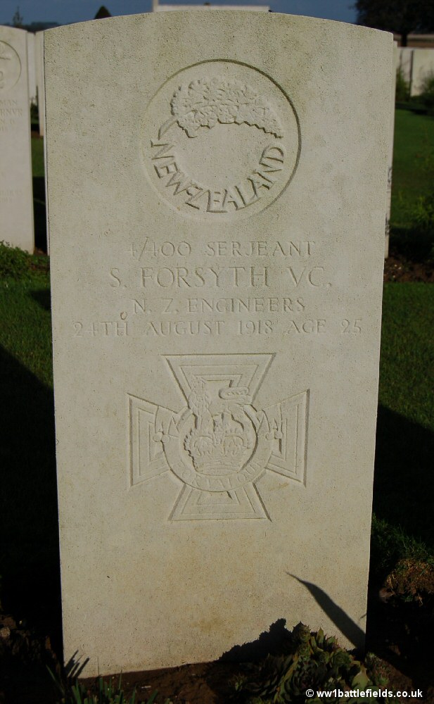 The other V. C. was won on the same day that Courcelette was taken for the second time by the Allies, the 24th of August 1918. It was won however at Grevillers, about four miles north-east of here. Serjeant Samuel Forsyth served with the New Zealand Engineers, but was attached to the 2nd Battalion when he won the V. C. for leading attacks on three German machine gun positions during an attack. He then tried to enlist the help of a tank, but was wounded and the tank also put out of action. He still went on, leading the tank crew as well as his own men in an attack on the enemy, but was then shot and killed by a sniper.