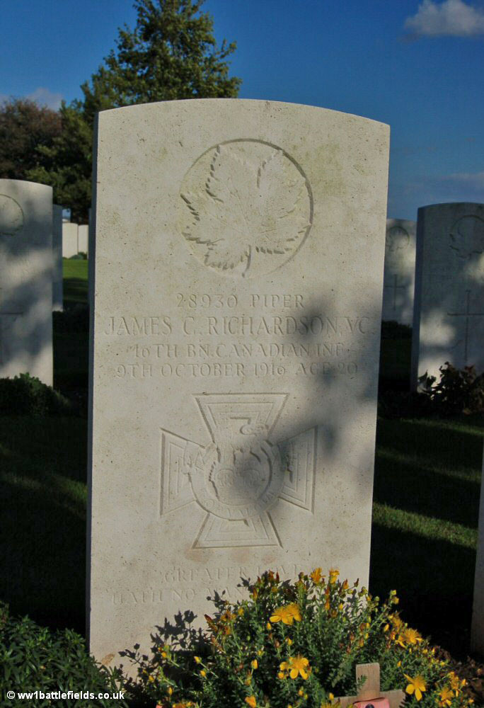 There are two Victoria Cross winners buried here; again one has an association with Regina Trench. This was Piper James Richardson, who enlisted in September 1914 and served with the 16th Canadian Battalion, although he was originally from Bells Hill, Lanarkshire in Scotland. On the 8th of October 1916 at Regina Trench his Company in the 16th (Canadian Scottish) Battalion was under intense fire, and held up by barbed wire. Richardson strode up and down outside the wire piping his Company forward, and they rushed and took the German position. Richardson was later sent back with a casualty and some prisoners, but returned when he remembered he had left his pipes behind, and was not seen alive again.