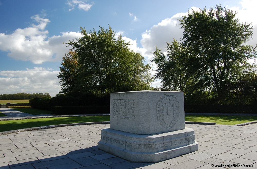 As at other Canadian Memorials, arrows set in the paths point to local landmarks, which here include the nearby village of Coucelette, as well as Bapaume and others. The lawns and grounds are immaculate and the memorial itself is in the form of a stone set right in the centre, surrounded by pathways. The inscription commemorates the Canadians part in breaking the German lines from the 3rd of September to the 18th of November 1916.