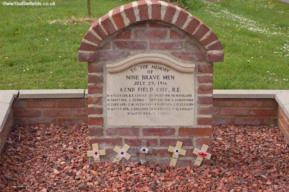 This memorial was originally made with bricks from the village, and was renovated in 1989; it commemorates men from the 82nd Field Company, Royal Engineers, who were killed on the 29th of July, 1916. Men were sent on wiring parties to Bazentin, with three killed one night and another six the next day. Another 19 were wounded on the second occasion, from a party of 40.