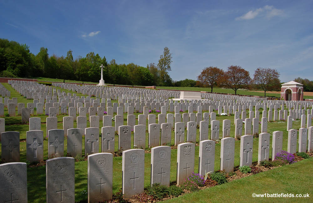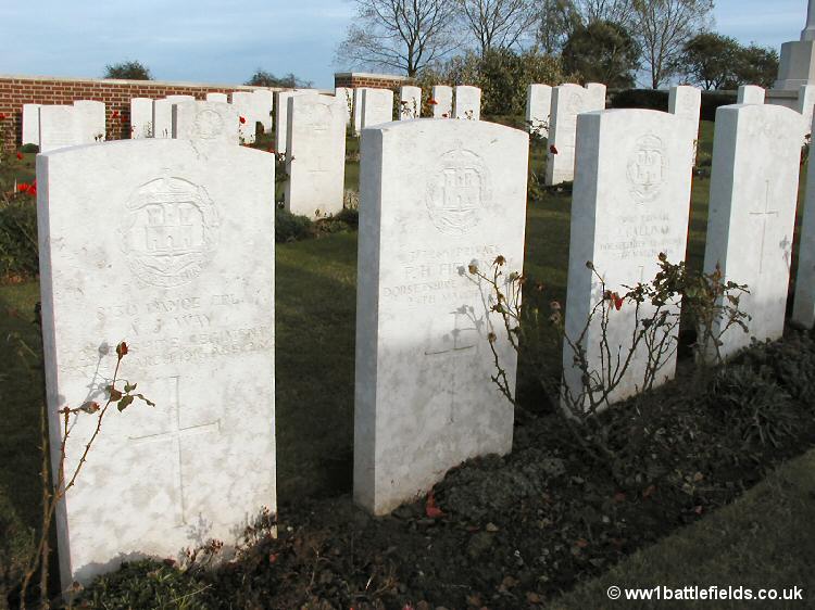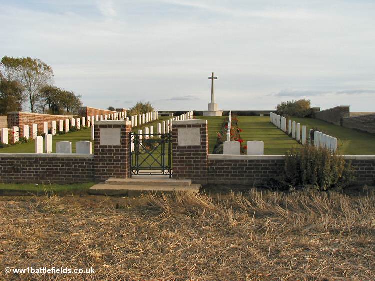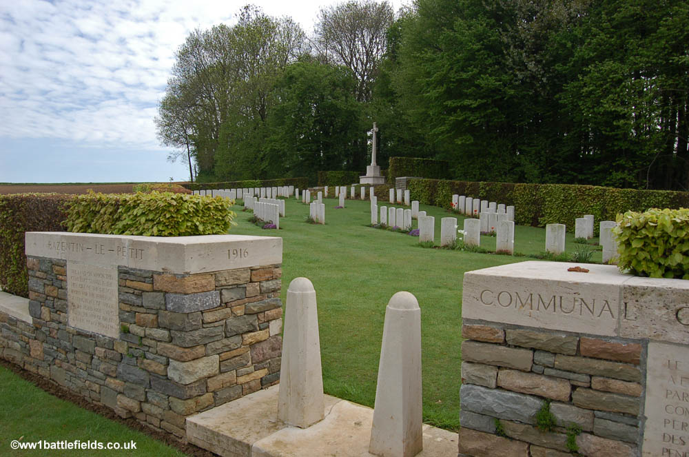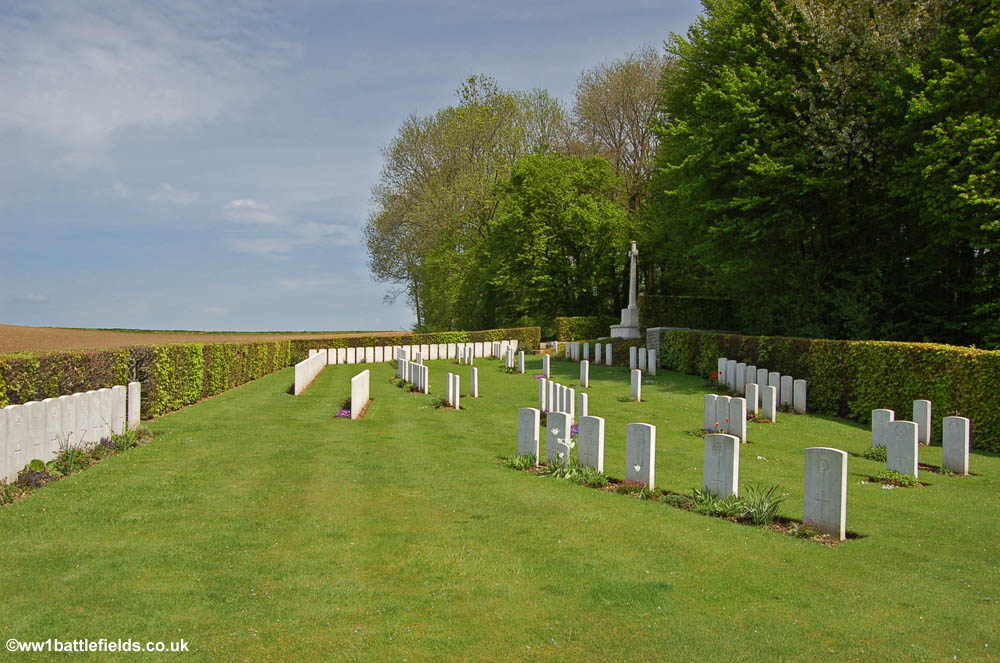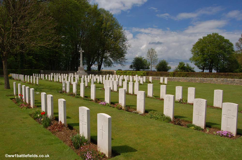 An Advanced Dressing Station was located here during the Somme offensives, and the cemetery was used from July 1916 until around May the following year. The Cemetery contains 182 burials, all but 15 of which are identified. There are some apparent spaces in the rows, which are the result of German graves which were here, but later removed. The Cross of Sacrifice is set in triangular section in one corner of the cemetery, and there is one special memorial right at he front of the cemetery by itself.
