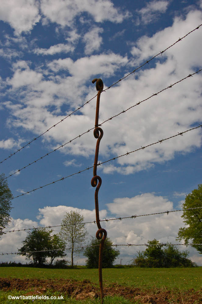 Further up the village street in Bazentin-le-Petit, a grass track to the left leads to Bazentin-le-Petit Military Cemetery. By the side of the grass track, silent pickets hold up the wire fence to right. They can also be seen supporting other fences within the village.