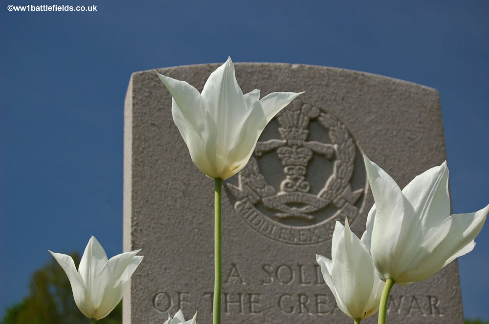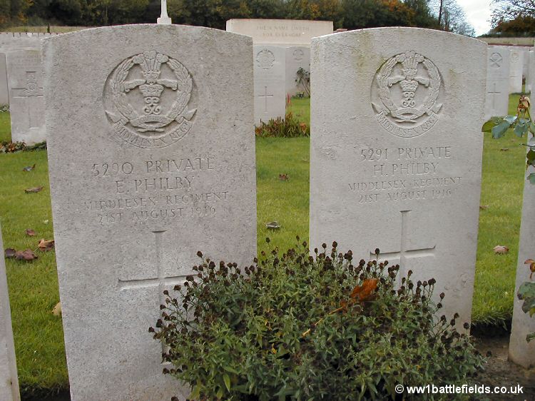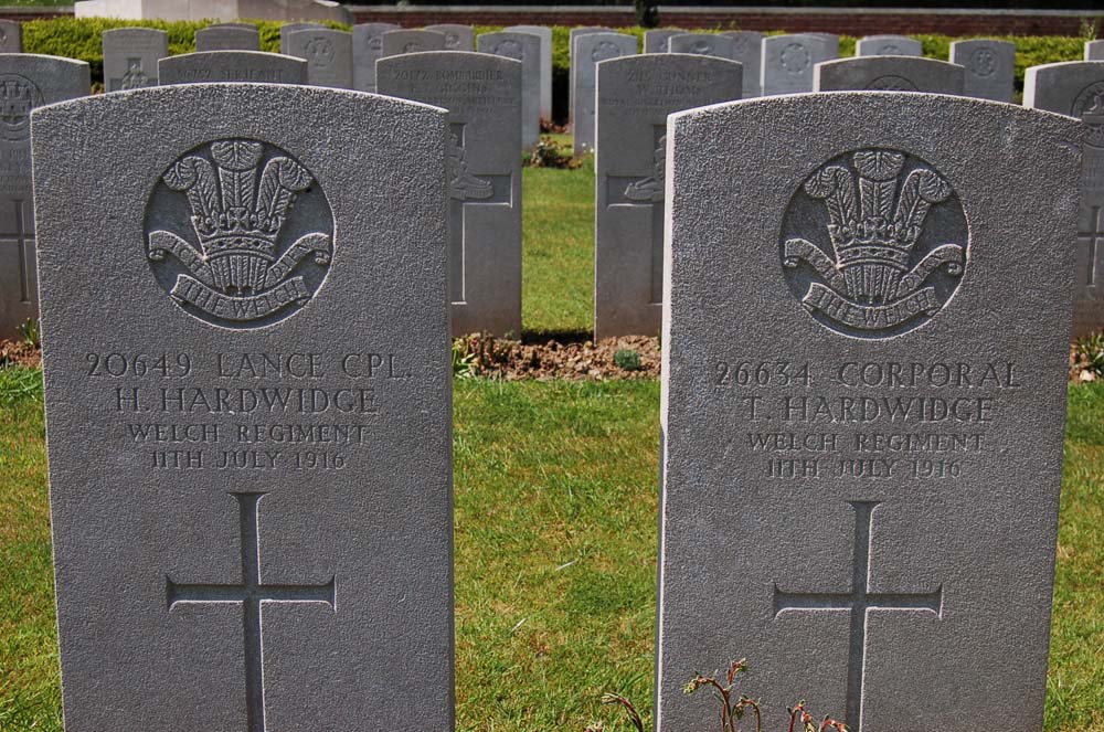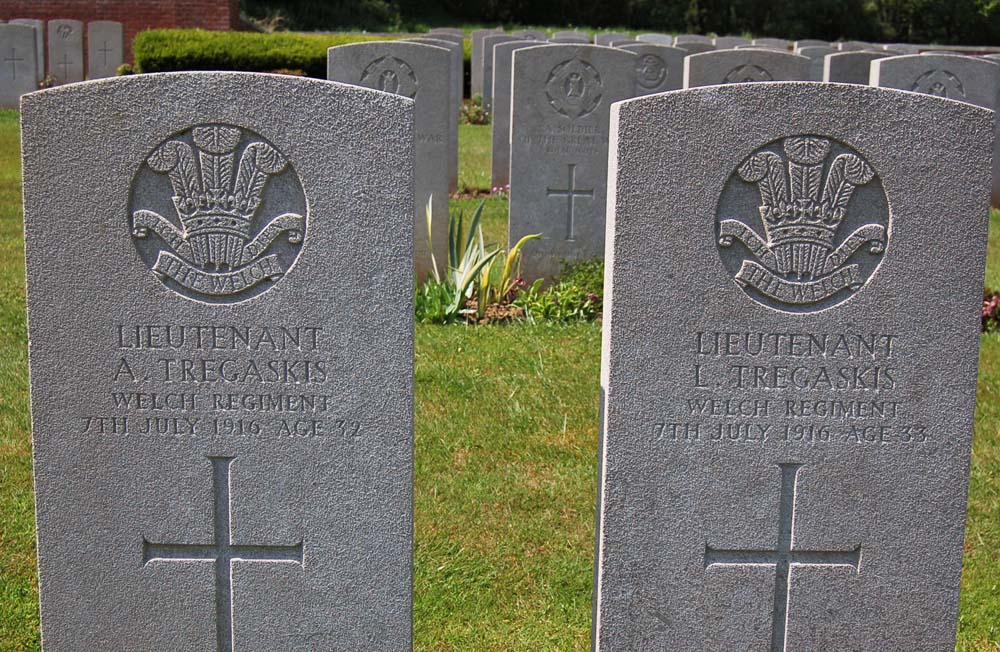 The cemetery is probably unique, in that there are three sets of brothers buried here, who in each case died on the same day and are buried side by side. The pictures below shows the graves of Ernest and Herbert Philby of the Middlesex Regiment, who both died on the 21st of August, 1916, Henry and Thomas Hardwidge of the 15th Welsh Regiment, who died on the 11th of July 1916, and Arthur and Leonard Tregaskis, both Second Lieutenants in the 16th Welsh Regiment who both died on the 7th of July 1916.