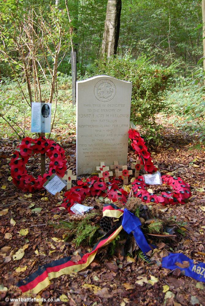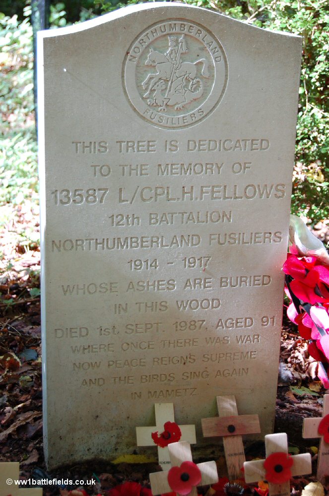 The spot is marked by a headstone which is quite similar to those seen in CWGC cemeteries, although the top is more curved. The stone records that in fact the ashes of Harry Fellows, of the 12th Northumberland Fusiliers, were buried here after he died in 1987, aged 91.