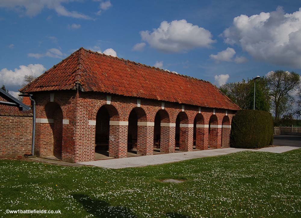 The gateway here was unveiled on the 13th of September, 1925, by Lieutenant-General Sir George Gorringe, who commanded the 47th Division after Charles Barter. The village war memorial stands in front of the school, and this was unveiled on the same day by the French.