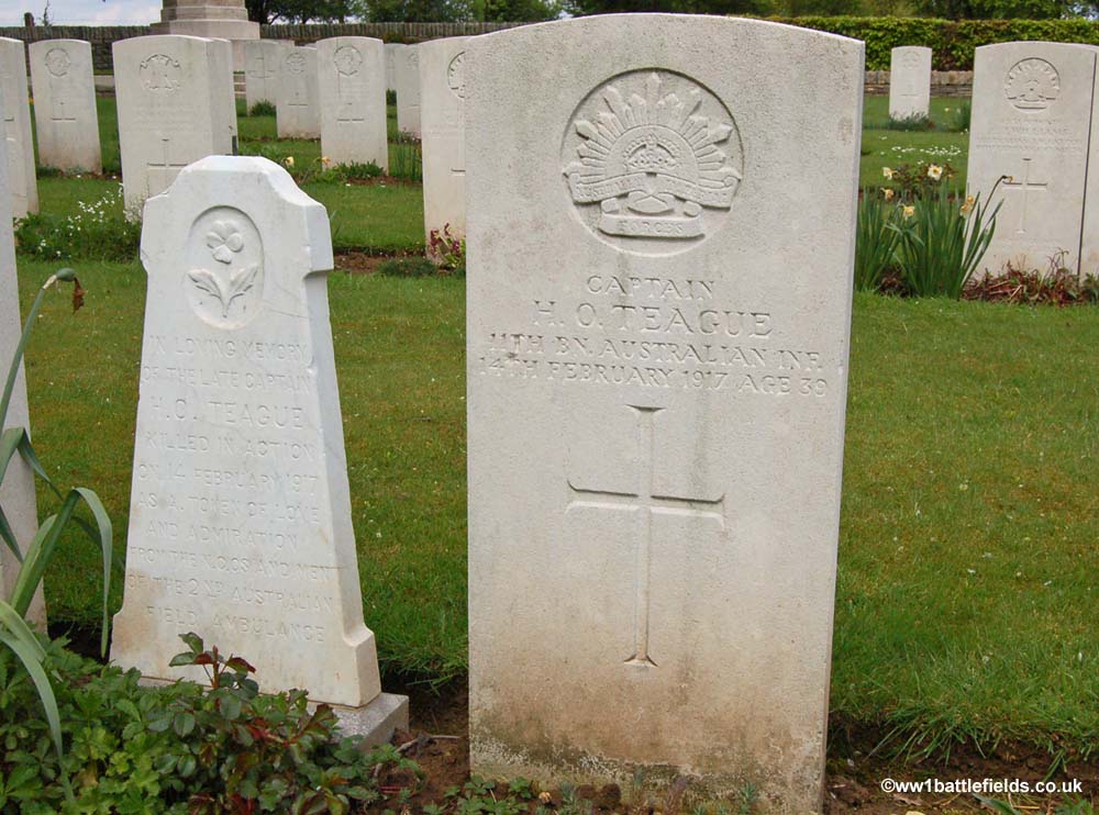 One of the interesting graves here is that of Captain Harold Teague, a member of the 11th Battalion of the Australian Infantry. He died on Valentines day, 1917, and his grave has not only the usual CWGC headstone, but also a smaller headstone beside it, shown in the pictures below. A wooden cross may once have been on the 'pin' that can be seen on the top of the smaller stone.