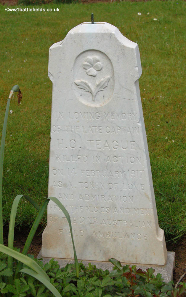 One of the interesting graves here is that of Captain Harold Teague, a member of the 11th Battalion of the Australian Infantry. He died on Valentines day, 1917, and his grave has not only the usual CWGC headstone, but also a smaller headstone beside it, shown in the pictures below. A wooden cross may once have been on the 'pin' that can be seen on the top of the smaller stone.