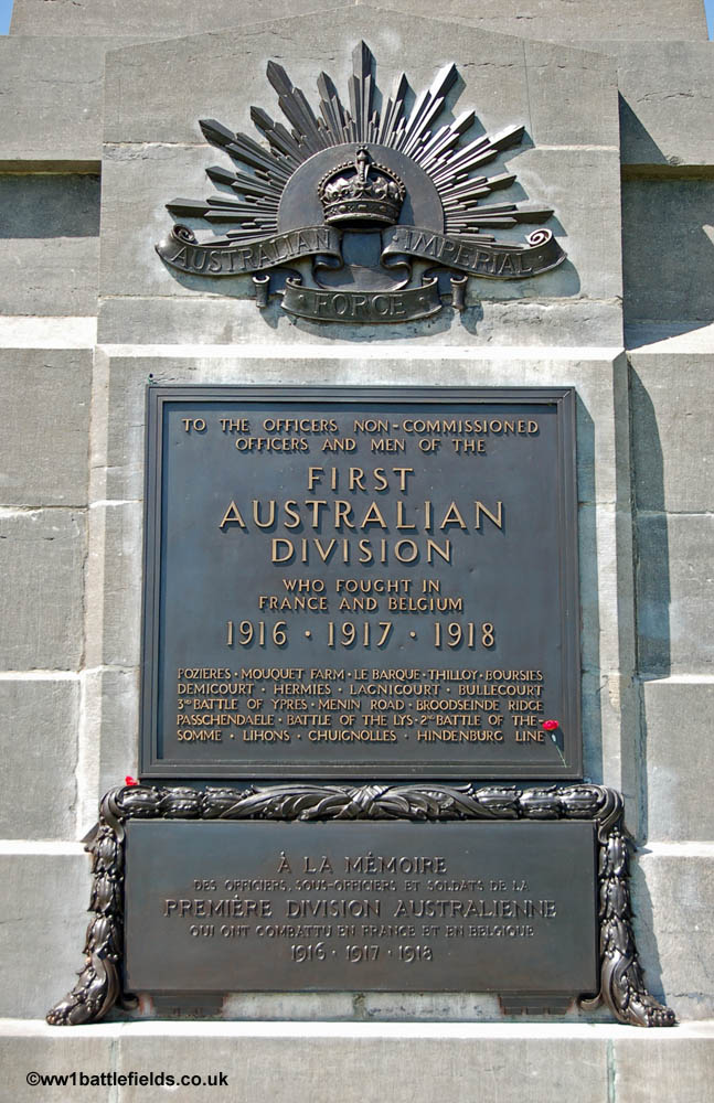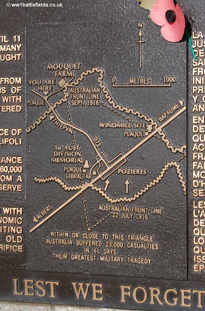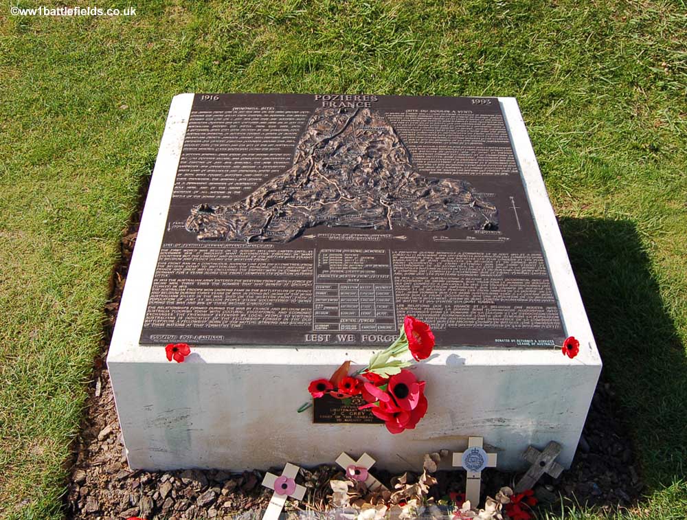 A walkway leads up to a memorial stone bench with an inscription that records the capture of this site on August the 4th 1916, and states that the Australian troops "fell more thickly on this ridge than on any other battlefield on the war". Behind this is a Ross Bastiaan bronze plaque, similar to those located at other sites of particular significance to the Australian forces. The plaque, which was unveiled by Lieutenant-General J.C. Grey on the 30th of August 1993 gives information about the battle, stating that the Australians went into battle here on the 23rd of July 1916 and fought until they were relieved on the 5th September by the Canadians. It also has a relief map of the Somme area.