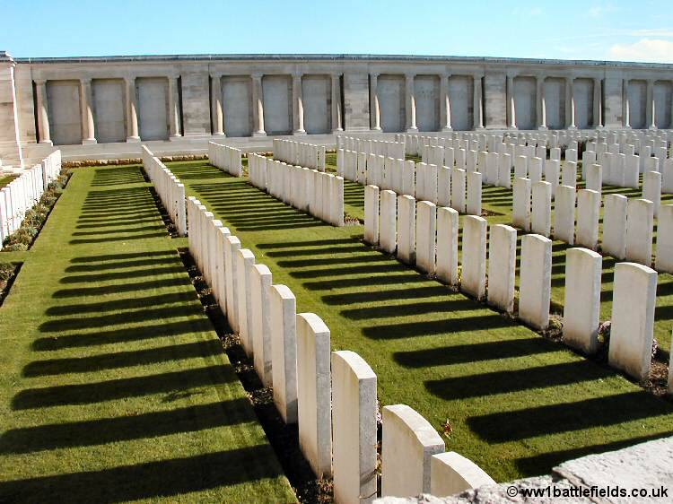 The memorial takes the form of panels along the left, rear and right of the cemetery, with the names of those with no known graves inscribed by regiment.
