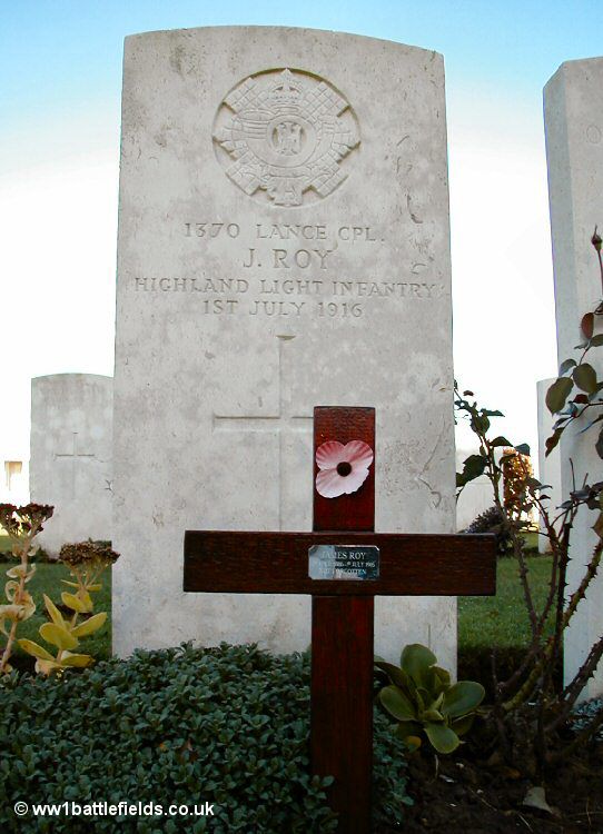 After placing the picture of this grave on this web-page, I was contacted by Malcolm James Roy, great-nephew of James Roy. It was Malcolm who made and placed the cross in front of his Great-Uncle's grave, in 2005. Malcolm also kindly provided some more information on James Roy. James was born on 7th April, 1886 at Chapelton Cottage, Maybole, Ayrshire in Scotland. He enlisted in late 1914 and was one of the Glasgow Boys Brigade volunteers who formed the 16th Battalion Highland Light Infantry. Following training at Gailes in Ayrshire the battalion moved to England in May 1915 to continue training. James sailed from Folkstone for France on the 23rd of November, 1915.