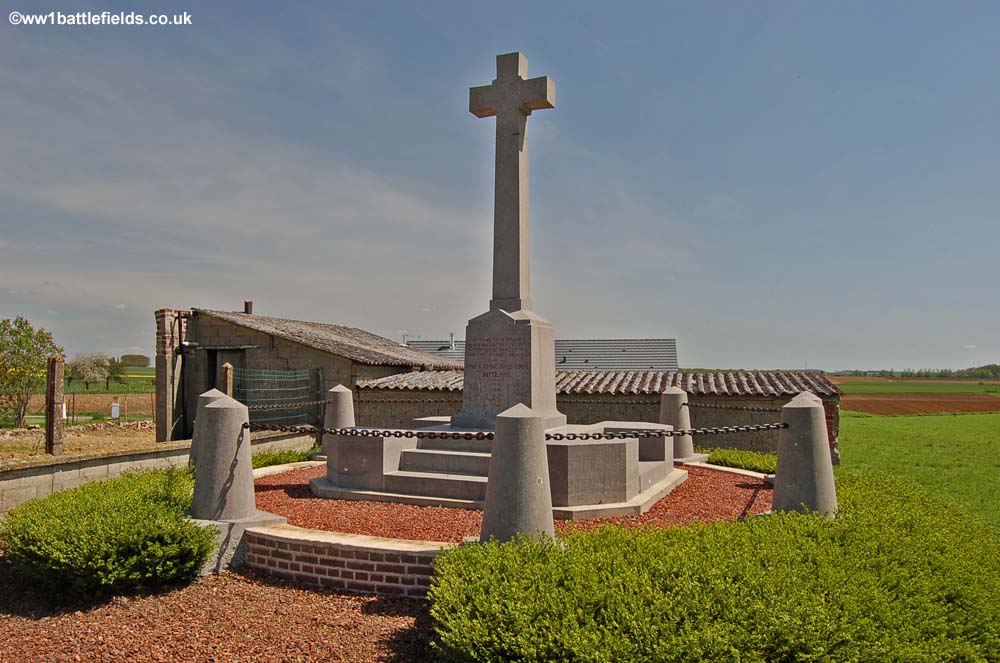 In recent years the stone bollards around it and the memorial have been cleaned, and the monument, the inscription and the insignia look better than before. There is a Ross Bastiaan bronze tablet on the site, and across the road is the wooden observation platform mentioned earlier. This gives outstanding views across the battlefield, and there are markers on the railing indicating sites that can be seen at various points such as Thiepval (the memorial can be seen clearly from here). Pozieres British Cemetery not far away down the D929 towards Albert can also be seen, and the golden virgin on the basilica in Albert itself when the weather permits. When the weather is wet however, the planks the observation tower is constructed of can be somewhat slippery and care should be taken.