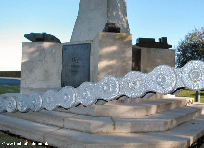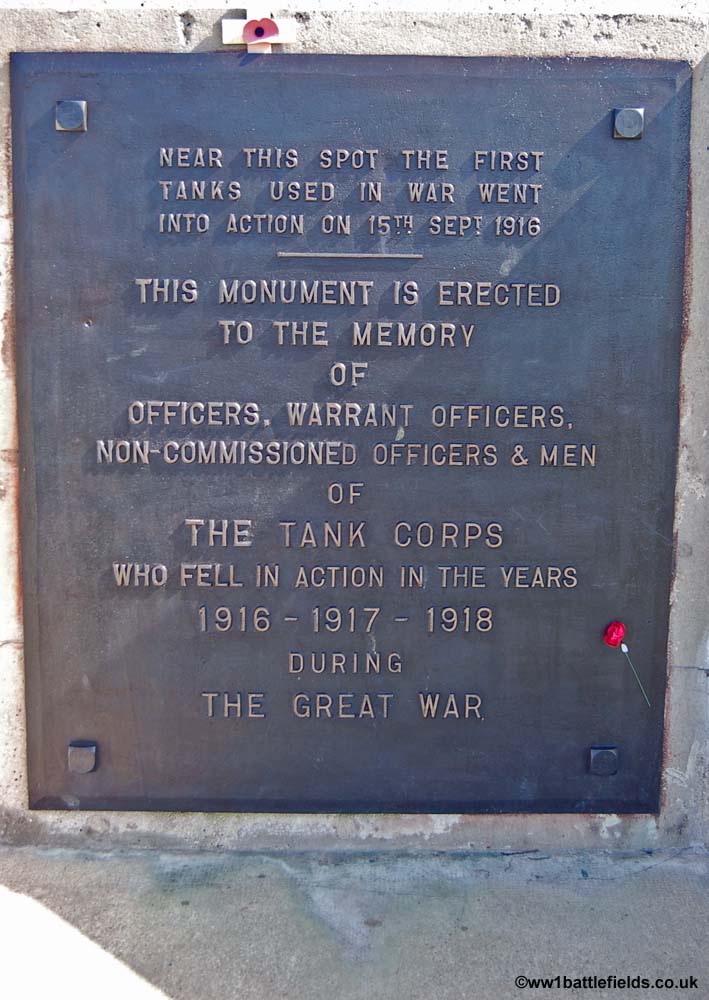 Just after the radio mast on the left is the Tank Memorial. Three tanks set off from this point on the first day they were ever used as a weapon of war; 15th September 1916. The memorial has an inscription on the front commemorating this.