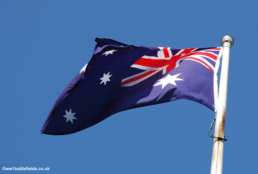 Directly opposite the Tank Memorial, across the road, is the first of several sites associated with the Australians who fought so hard in this area. This is the site of Pozieres Windmill, which was located on the highest point of Pozieres ridge and in fact the highest point (known as Hill 160) of the Somme battlefield. The site is flanked by the flags of Australia and France, and two large stones with the insignia of the Australian Imperial Force stand by the walkway leading to it.