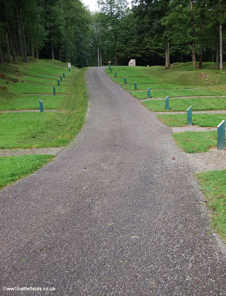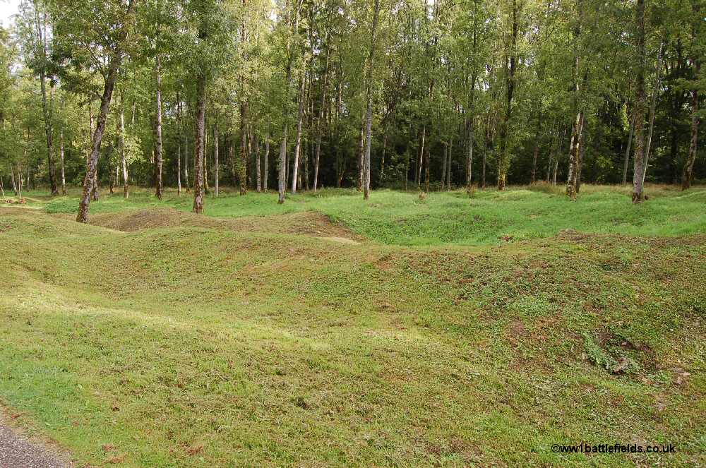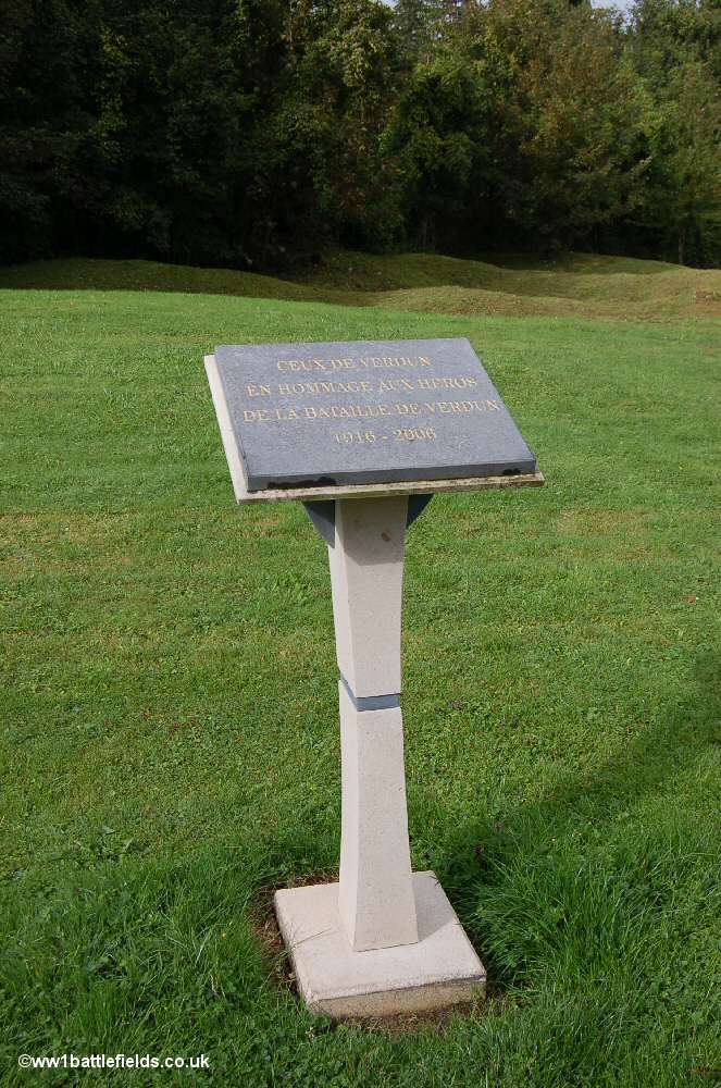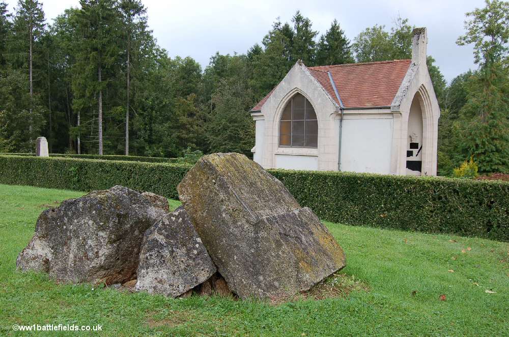 Very close to Fort Douaumont is the site of the destroyed village of Douaumont. The ground here bears the scars of the furious shelling that took place. Before the war, the village had a population of nearly three hundred, including a cobbler, a tobacconist, three stonemasons, several farmers and a teacher. There were around fifty houses. The name of the village derived from 'Divine Mountain', and it probably dated from Roman times.