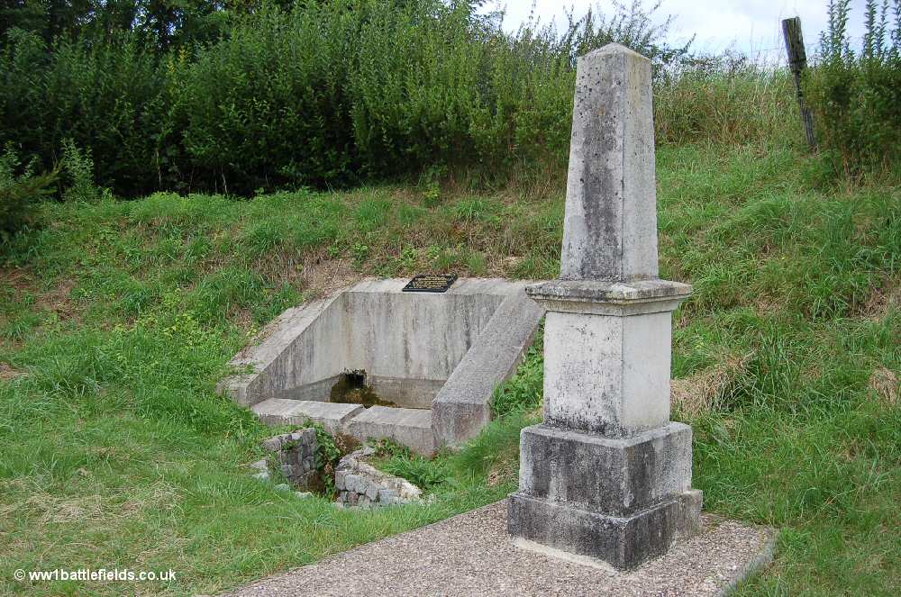 Returning to the D18, this road continues south and then joins the D38. Turning left , after about three miles is another left turn that leads nothward towards Mort-Homme. On the right side of this road is a fountain commemorating Capitaine Lemoelle. The plaque records that he fell gloriously at the head of his Company on the 16th of March 1916, when he attacked Corbeaux Wood shouting 'Forward'.