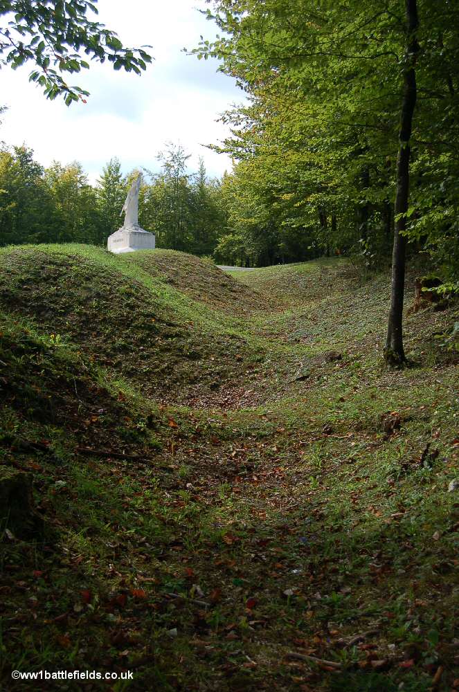 There are also the remains of trenchlines in the trees nearby, but without doubt the most striking and well-known feature here is the main Mort-Homme monument (see below).